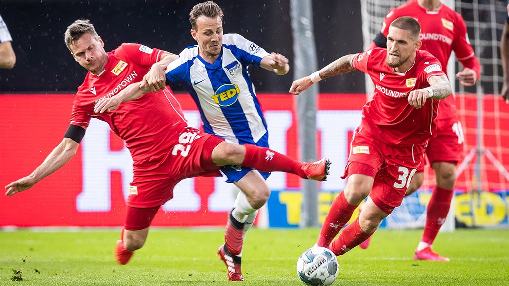 Im Olympiastadion entwickelte sich in der ersten Halbzeit ein ausgeglichenes Spiel, in dem Hertha BSC ein Chancenplus verzeichnen konnte. Mit dem ersten Torschuss der Partie prüfte Matheus Cunha Rafal Gikiewicz im Tor der Eisernen, mit dem Flachschuss des Brasilianers hatte der polnische Schlussmann jedoch keinerlei Probleme (5.). Auf der anderen Seite brachte Marius Bülter den Ball nach einer Trimmel-Flanke in Richtung Tor, das Leder senkte sich jedoch erst oben auf das Tornetz (14.). Während die Partie im Mittelfeld heiß umkämpft war, versuchten es die Herthaner offensiv vor allem über die rechte Angriffsseite. Einen langen Abstoß von Torhüter Jarstein verlängerte Kapitän Ibisevic per Kopf in den Lauf des schnellen Dodi Lukebakio, im Eins gegen Eins behielt Gikiewicz jedoch die Oberhand und wehrte den gefährlichen Angriff der Charlottenburger zur Ecke ab (18.). Die Eisernen zeigten sich in den Zweikämpfen aggressiv, ließen in der ein oder anderen Situation jedoch noch die nötige Präzision vermissen. Die Hertha versuchte ihr Glück weiter über den rechten Flügel, nach einem Angriff von Ibisevic war erneut Cunha zur Stelle, diesmal mit der Hacke. Wieder war Gikiewcz zur Stelle und entschärfte die Situation (27.). Erst kurz vor dem Pausenpfiff zeigten sich die Köpenicker erneut gefährlich und verzeichneten die bis dato beste Möglichkeit der Partie (44.). Mittelfeldakteur Robert Andrich versuchte sein Glück mit einem direkten Freistoß aus knapp 25 Metern, der Ball senkte sich zwar über die Mauer hinweg in Richtung Kreuzeck, verfehlte das Ziel jedoch um wenige Zentimeter. Nach exakt 45 Minuten bat Schiedsrichter Harm Osmers beide Teams zur Halbzeitpause.