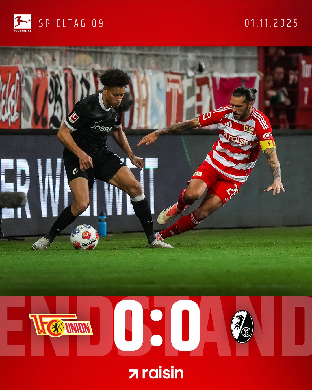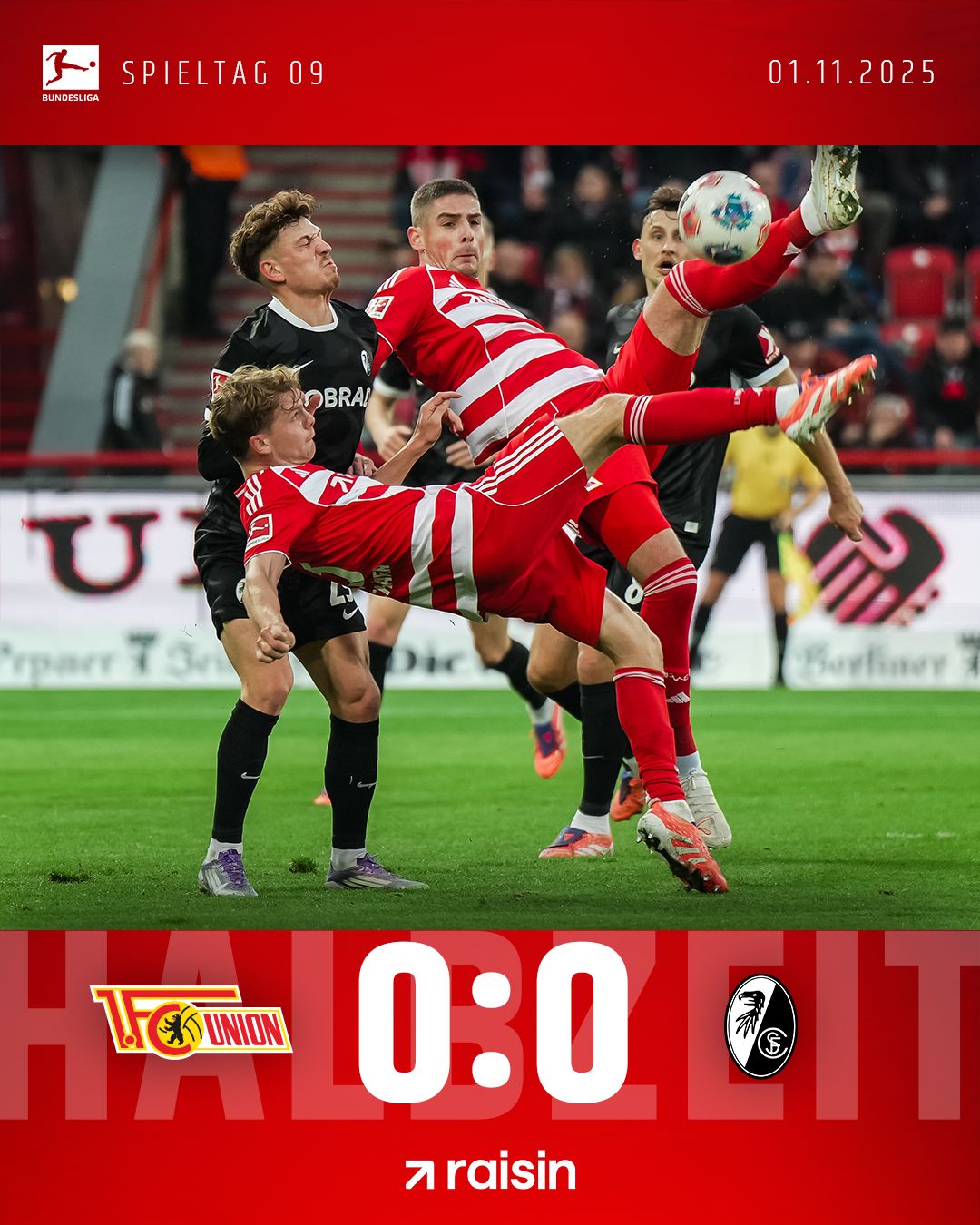 Nullnummer zur Pause. Uns gehörte die Anfangsphase, da strahlten wir deutlich mehr Gefahr aus als zum Ende des ersten Durchgangs. Nach dem aberkannten Treffer der Freiburger gaben wir mehr und mehr Spielanteile an die Gäste ab. Die konnten daraus aber auch kein Kapital schlagen. Meist stehen wir gut, halten unsere Reihen dicht – ab und zu war es aber auch Glück oder Unvermögen des Gegners. Ich würd‘ mich freuen, wenn wir uns ein paar Anteile an der Partie in der zweiten Halbzeit zurückholen und wir dann vor der Waldseite nochmal was zu feiern haben. Bis gleich, Unioner!