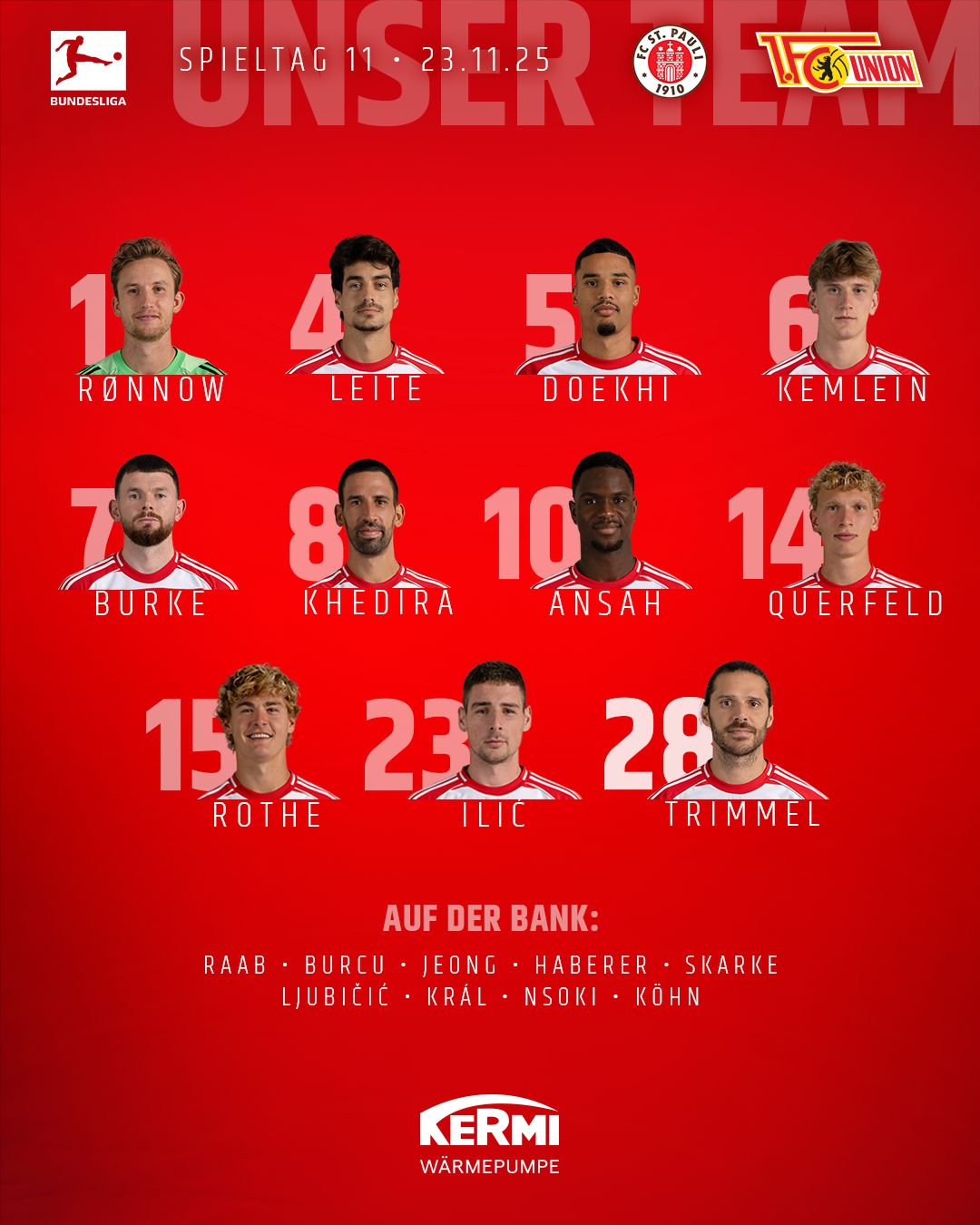Unser Cheftrainer Steffen Baumgart schickt heute die folgende Elf auf den Rasen: