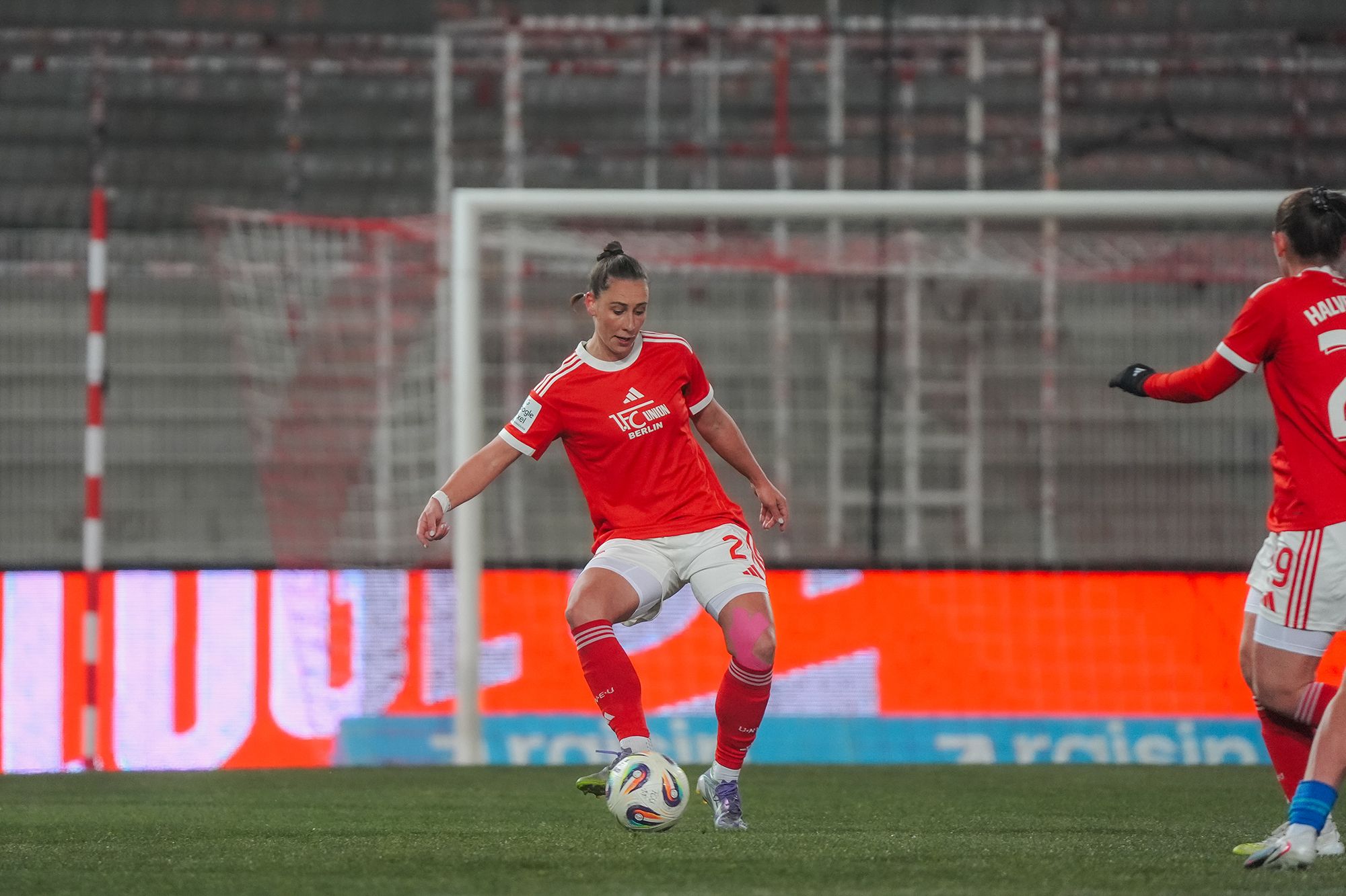 Eine Spielerin in rotem Trikot dribbelt den Ball auf dem Spielfeld während eines Fußballspiels.