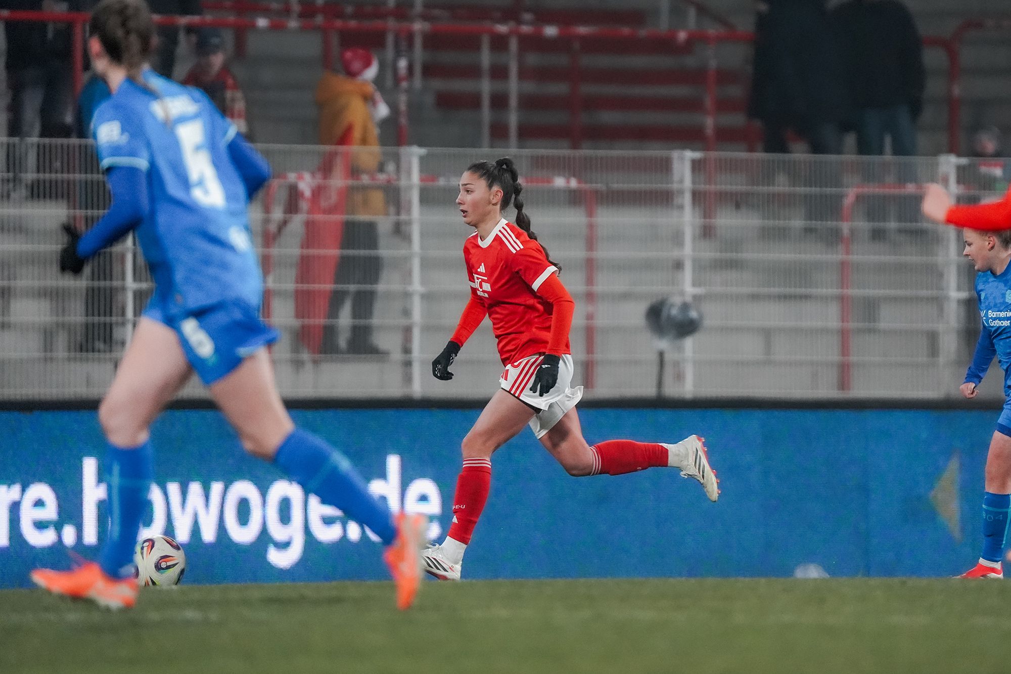 Der Start ins Pflichtspieljahr 2026 war gut für die Eisernen. Nach 70 Sekunden hatte Amber Tysiak eine große Chance. Sie verlängerte den Ball bei einer Ecke. Eine Spielerin von Leverkusen klärte auf der Torlinie (2.). Die Unionerinnen spielten mutig. In den ersten viereinhalb Minuten hatten sie vier Ecken. Diese sorgten für Chaos im Strafraum von Leverkusen.