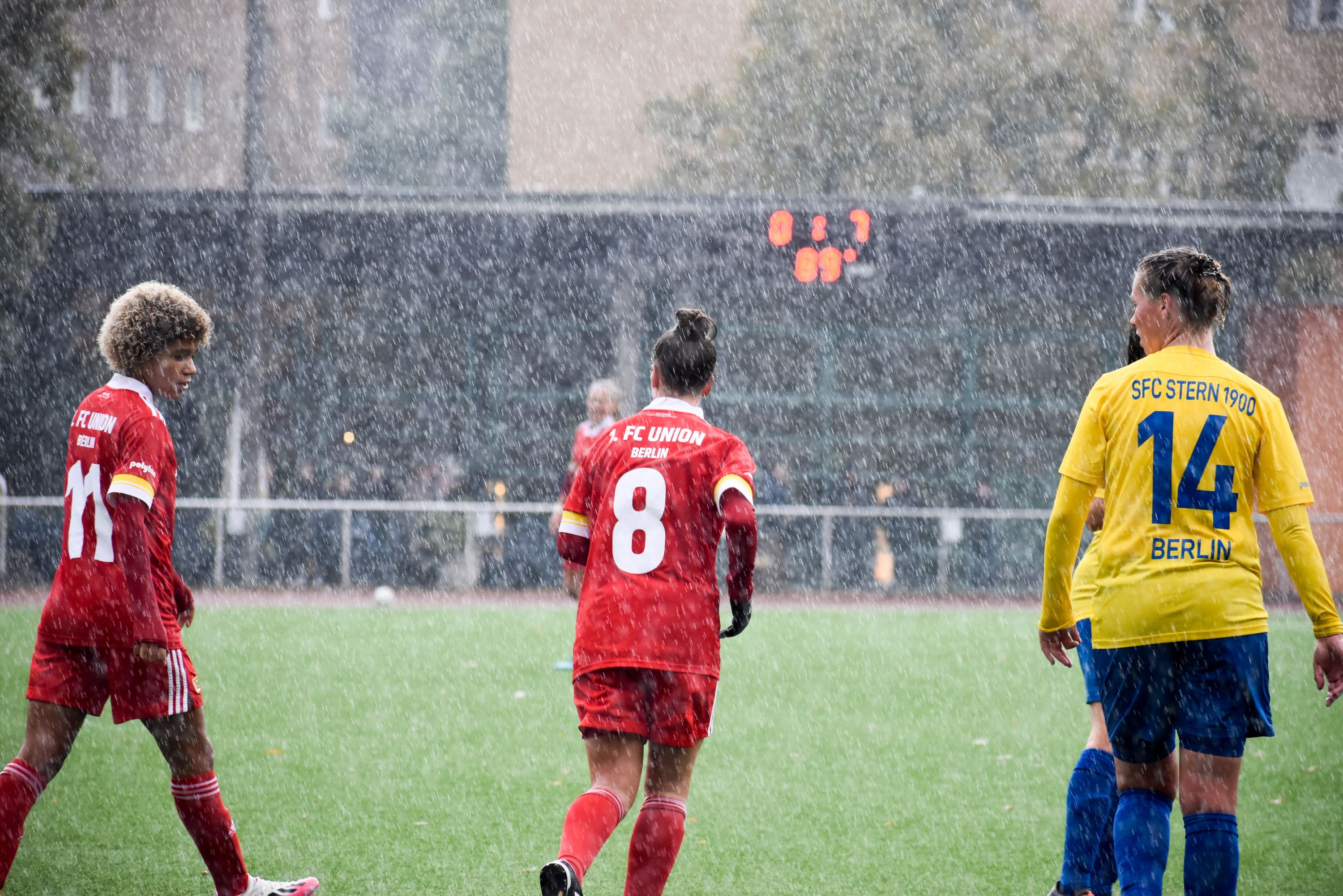 Am fünften Spieltag empfängt Stern 1900 unsere Eisernen Ladies auf dem Kunstrasen in der Kreuznacher Straße. Das regnerische Wetter lädt zum Flachpassspiel ein und erzeugt von Beginn an eine kämpferische Atmosphäre. Nach der knappen 2:3-Niederlage Sterns gegen den Top-Favoriten Viktoria Berlin im Pokal musste diese Mannschaft von Beginn an ernst bespielt und die Räume defensiv verdichtet werden. Bereits nach vier Minuten taucht Elisa Spolaczyk zweimal gefährlich vor dem gegnerischen Tor auf. Sie trifft nach einer Vorlage von Lisa Heiseler in der zweiten Situation zum 1:0. Zuvor wird der Angriff aus der Viererkette heraus solide über Josephine Ahlswede, Marta Schrey und Josephine Bonsu aufgebaut. Ein Gemeinschaftsprojekt, welches zwei Minuten später erneut zum Erfolg führte. Josephine Bonsu dribbelt im 1 gegen 1 außen an allen Gegnerinnen vorbei und bringt die Hereingabe in die Box so gefährlich, dass eine Spielerin von Stern den Ball selber zum 2:0 einnetzt.