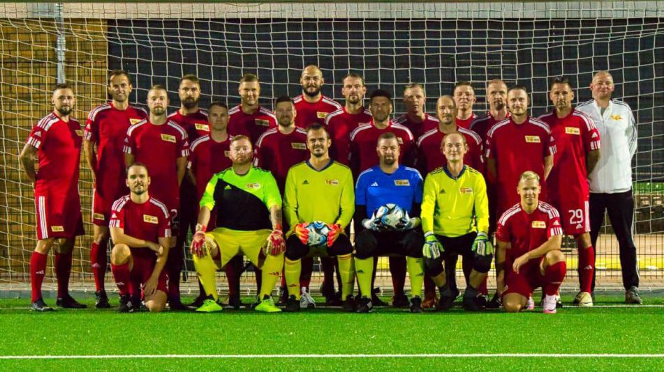 Gruppenfoto von 24 Fußballspielern in roten Trikots, die vor einem Tor auf einem Rasenplatz stehen.