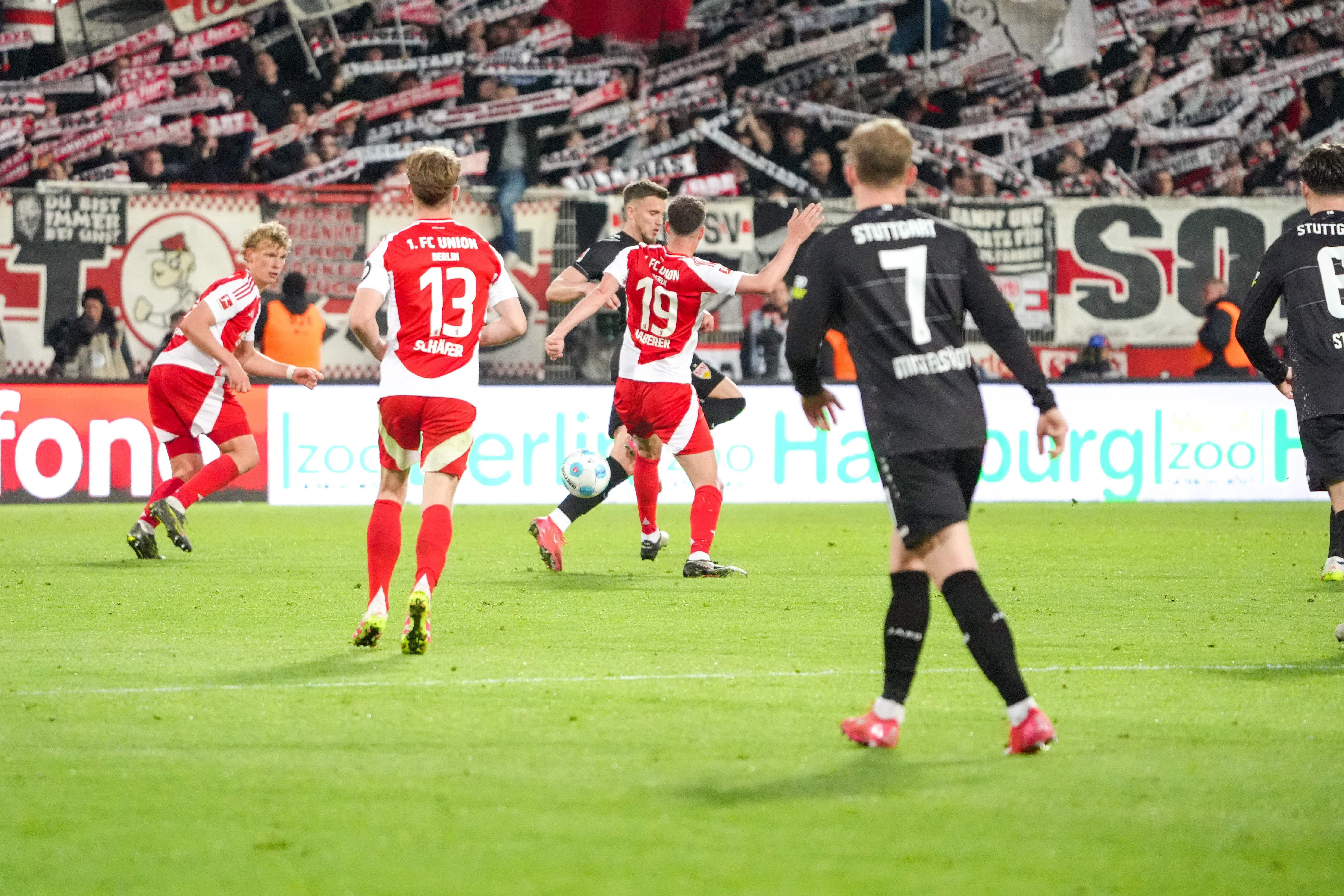 In den ersten fünfzehn Minuten der zweiten Halbzeit hielt Stuttgart den Ball lange in den eigenen Reihen und suchte vergeblich einen Weg durch die kompakt stehende Defensive der Hausherren, die auf Konter lauerten. In der 56. Minute hätte es die erneute Führung für Union sein können, der Schuss von Hollerbach aus der Distanz ging allerdings knapp übers Tor.