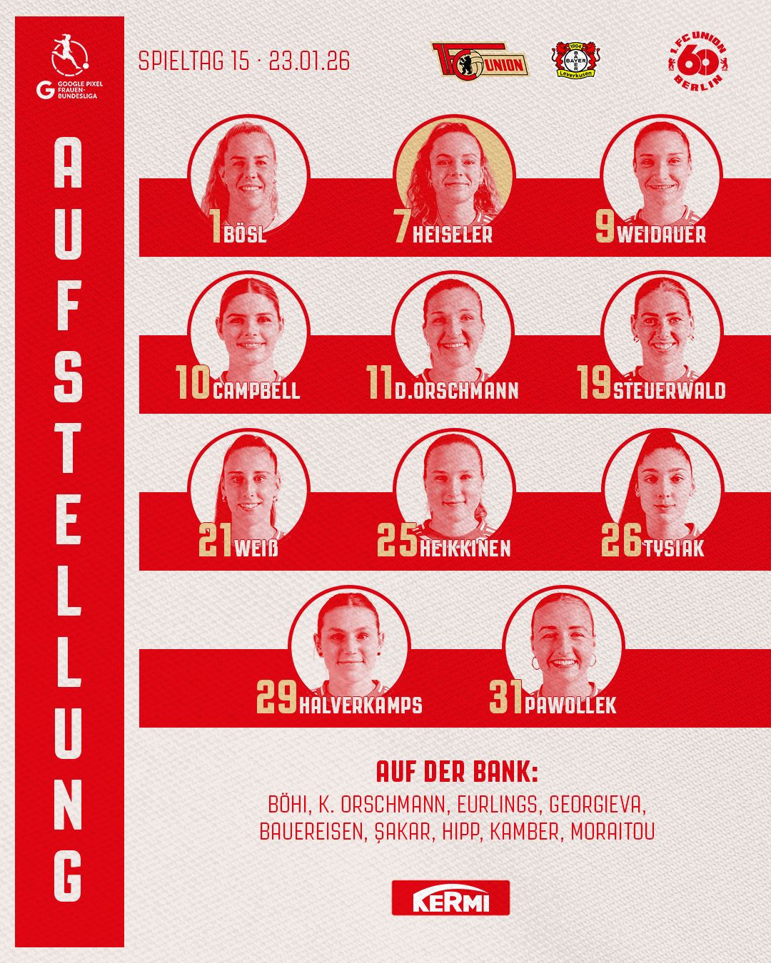Im Vergleich zum letzten Pflichtspiel gegen Nürnberg gibt es drei Änderungen in der Startelf: Ida, Amber und Tanja spielen für Marina, Judith und Jenny. Tanja ist wieder fit und unser Neuzugang Amber spielt zum ersten Mal in der Alten Försterei. - 17:15