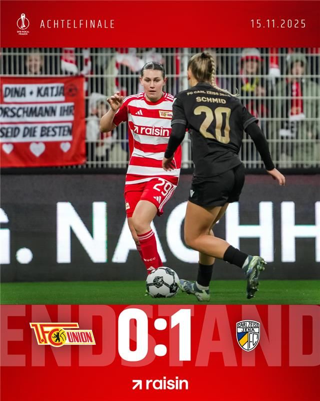Puh, mir fehlen gerade etwas die Worte, es ist einfach verdammt bitter. Jena gewinnt hier durch ein Eckentor kurz vor der Pause, weil wir unsere Chancen leider nicht nutzen und zweimal an der Latte scheitern. Es fühlt sich alles völlig falsch an. Unsere Mädels haben im zweiten Durchgang gekämpft und alles nach vorne geworfen, konnten sich aber vor allem in der Drangphase nach der Pause nicht belohnen. So endet unsere Pokalreise wie schon im letzten Jahr im Achtelfinale. Unioner, auch wenn es gerade hart ist: Die Mannschaft braucht euch jetzt mehr denn je! Schon am kommenden Freitag geht es in einem ganz wichtigen Ligaspiel gegen den HSV hier im Stadion An der Alten Försterei weiter. Kommt ins Stadion, unterstützt die Mädels und lasst uns endlich wieder einen Sieg. Bis dahin, kommt gut nach Hause, bleibt gesund und niemals vergessen…