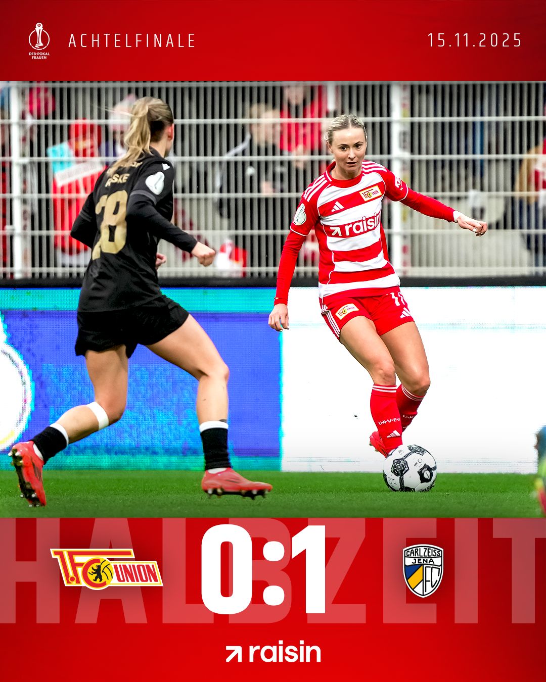 Puh, die Stimmung ist jetzt natürlich gerade etwas bedrückt. Wir haben eigentlich über 45 Minuten das Spiel kontrolliert und hatten durch Toni sowie Dina auch zwei dicke Chancen, aber Jena macht halt am Ende kurz vor der Pause das Tor. Hilft am Ende alles nichts, jetzt gilt es die Kräfte zu mobilisieren und im zweiten Durchgang voll anzugreifen – noch ist hier gar nichts verloren.