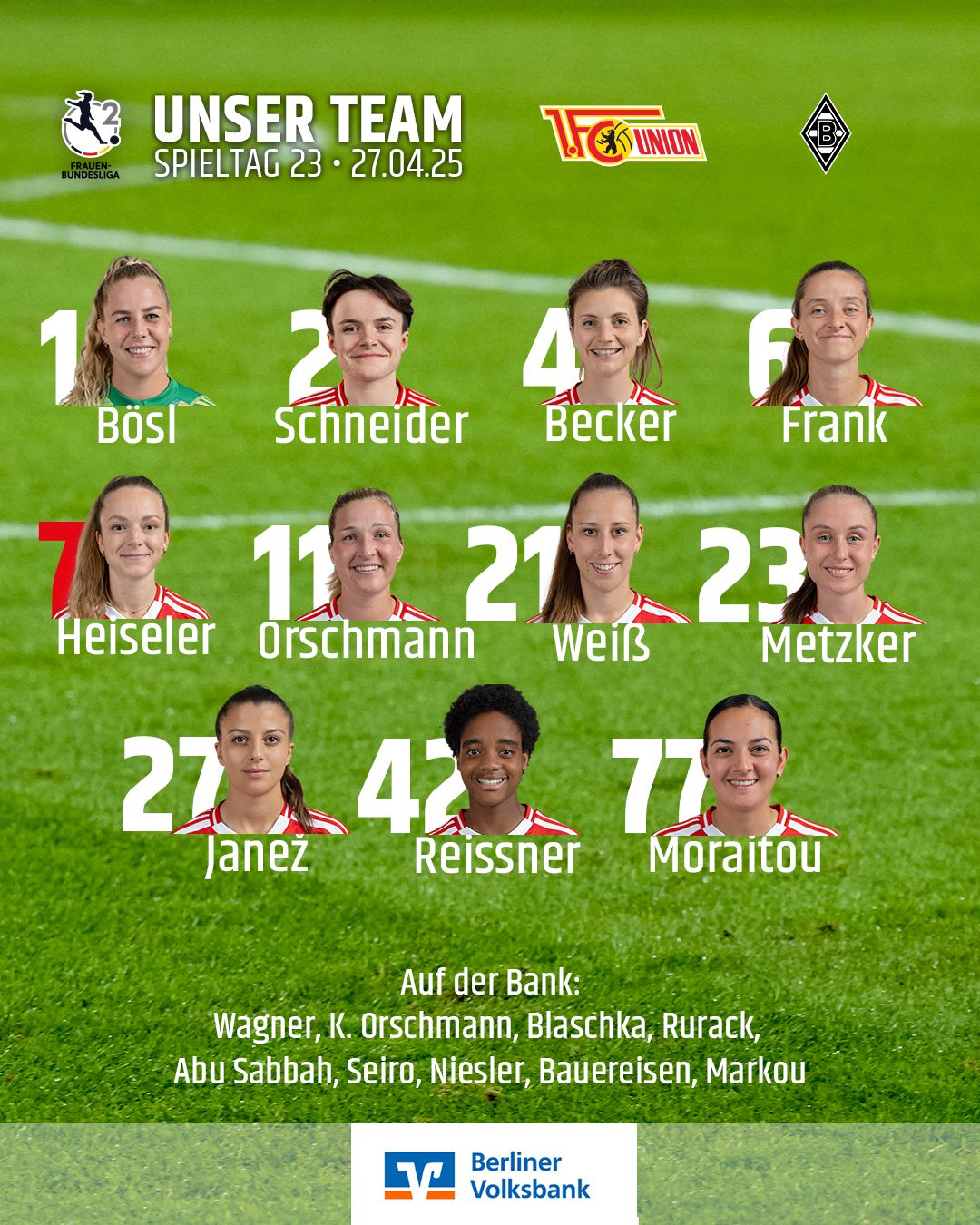 Unsere Cheftrainerin Ailien Poese schickt heute die folgende Elf auf den Rasen: