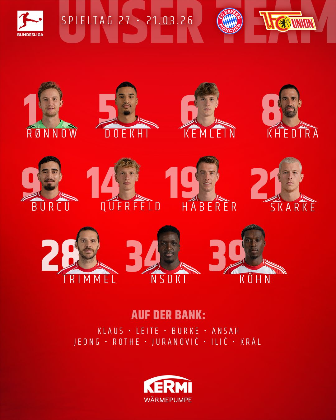Unser Coach Steffen Baumgart hat für den Auftritt in München wieder die Nummer eins zwischen den Pfosten am Start: Freddy kehrt zurück, nachdem ihn in Freiburg der bärenstarke Matheo vertreten hatte. Außerdem mischt Leo nach abgesessener Gelbsperre wieder mit und Youngster Joschi rückt ebenfalls in die Startelf – dafür nehmen Andrej und Ily erst einmal auf der Bank Platz. - 14:20