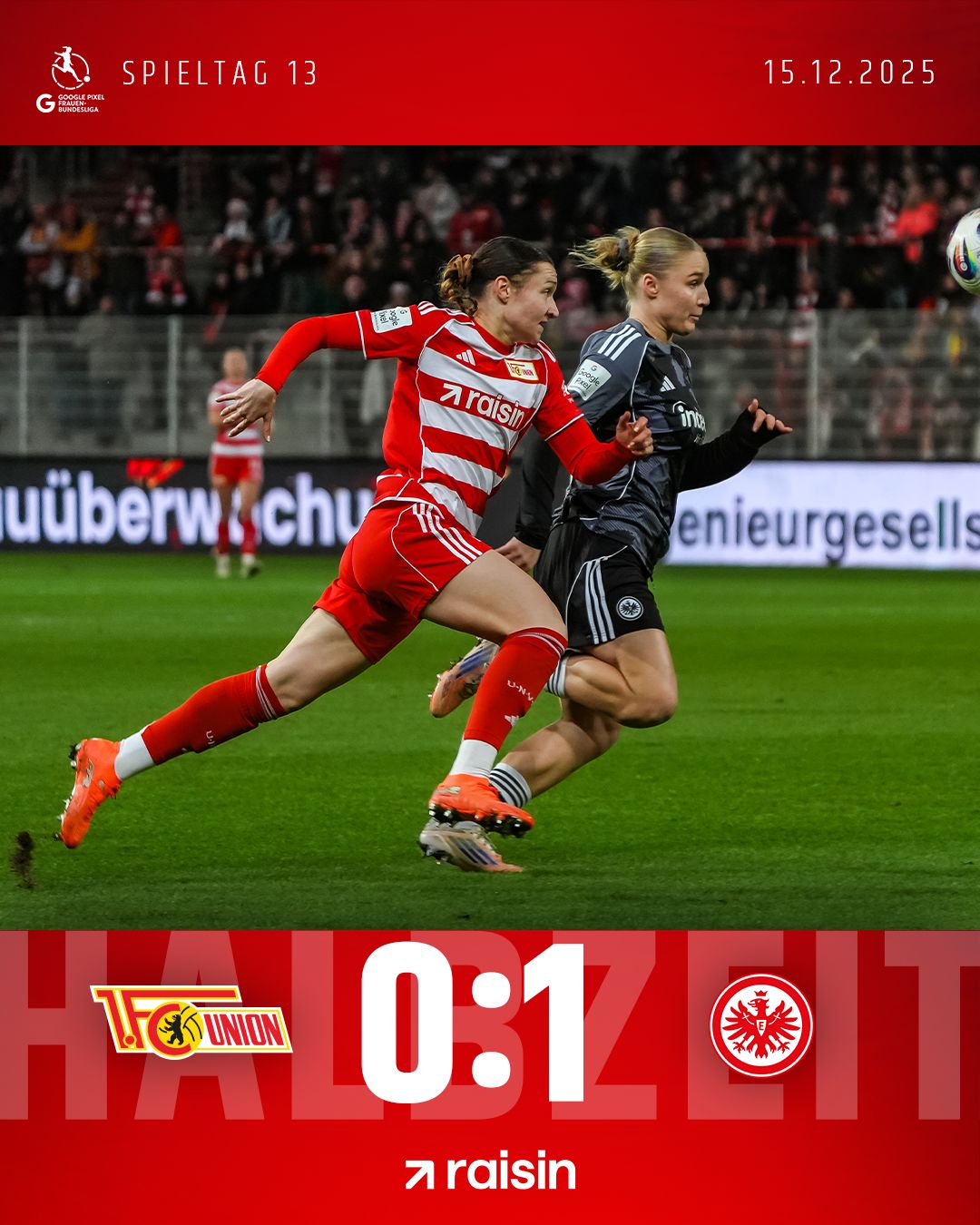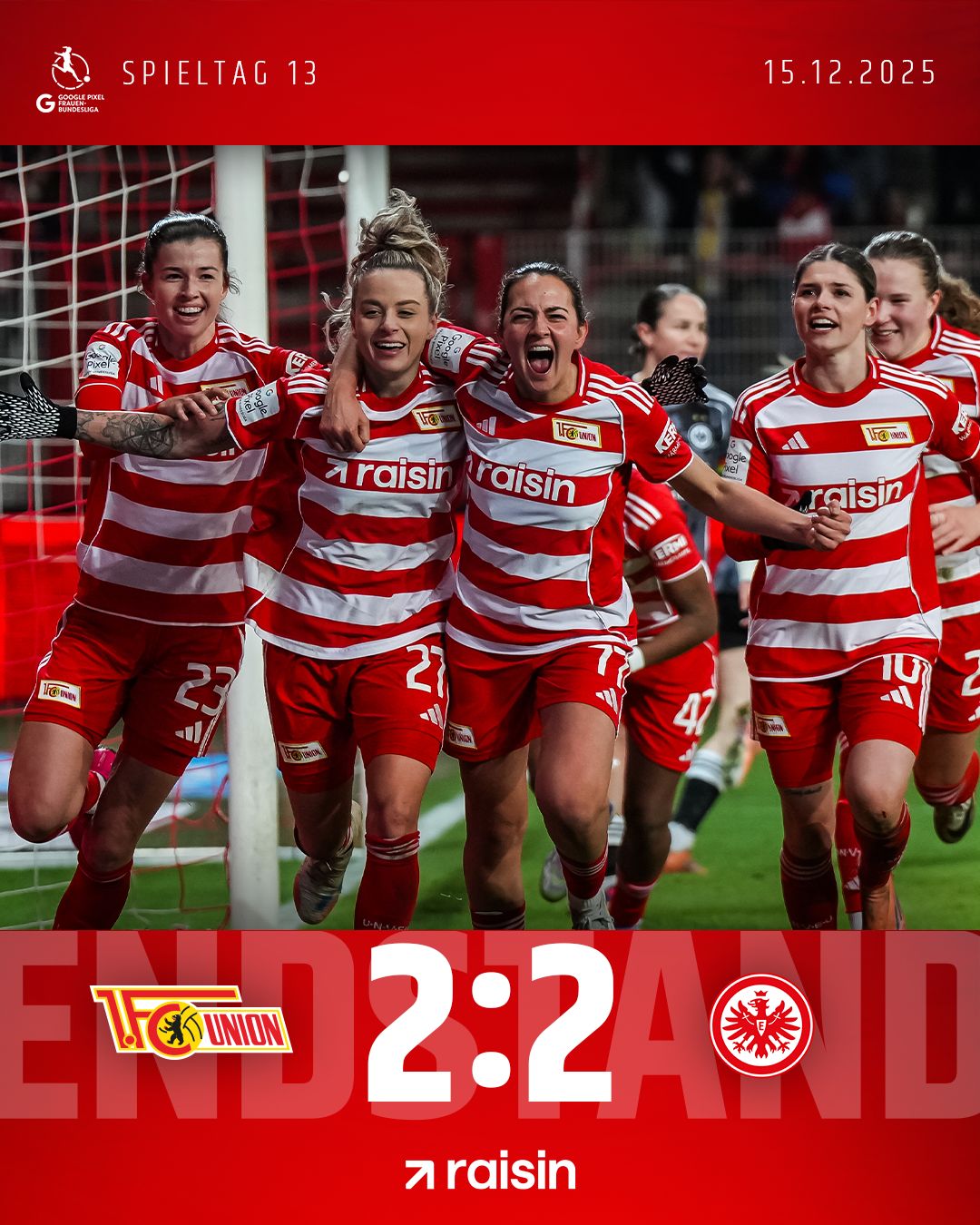 Was ein wilder Ritt am Ende! Wir holen im letzten Heimspiel des Jahres einen verdienten Punkt gegen das Topteam aus Frankfurt. Unsere beiden Sommerneuzugänge Sammy und Jenny erzielen jeweils ihre ersten beiden Treffer im Union-Trikot. Elfmeter müssen wir glaube ich nochmal üben, aber das ist für heute Abend erstmal egal. Wir feiern den späten Punktgewinn.