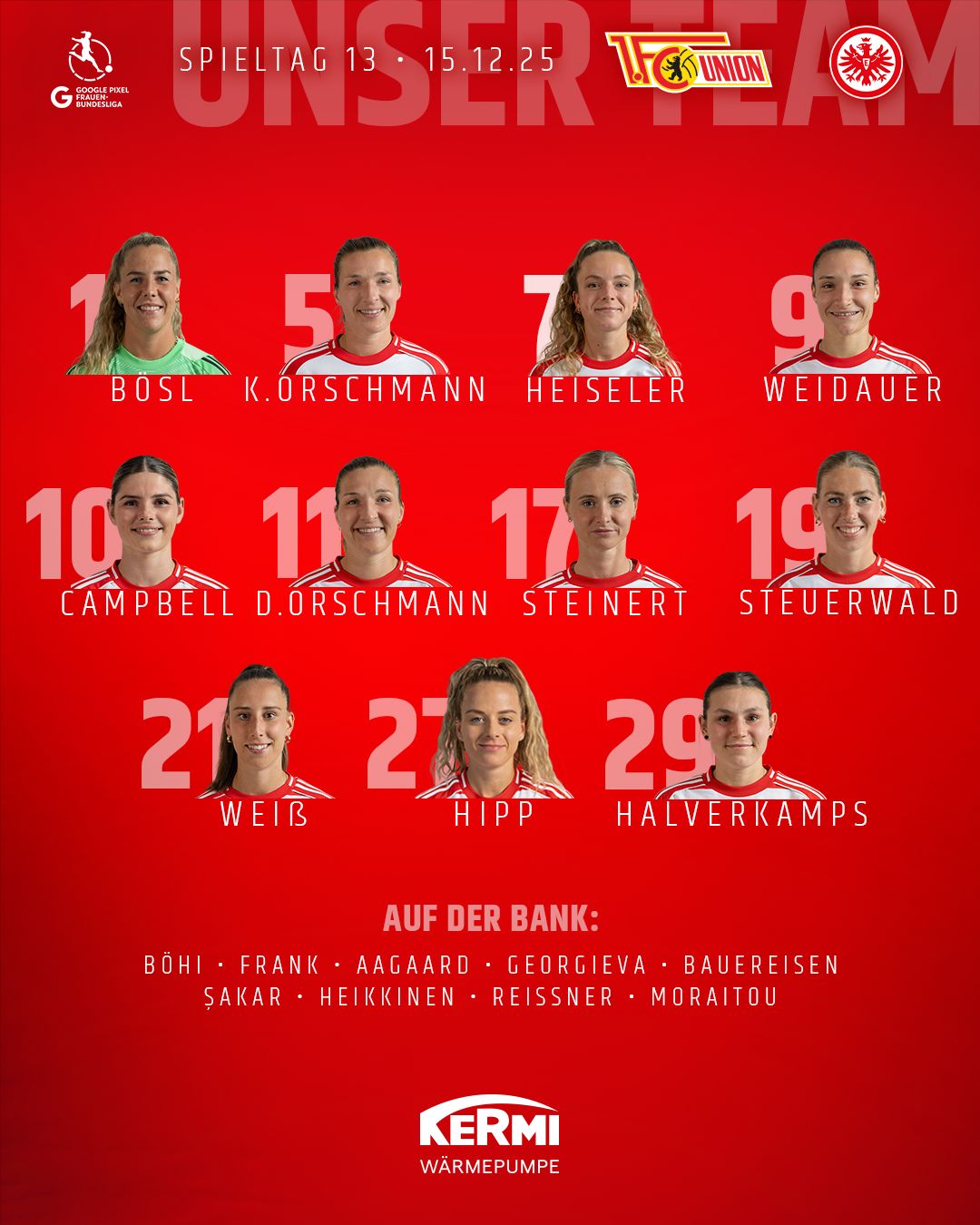Im Vergleich zur Gastpartie bei Hoffenheim gibt es eine Änderung: Cara rückt nach überstandener Verletzungspause zurück ins Tor. Ebenfalls wieder dabei ist Naiki, die nach über zwei Monaten erstmals wieder im Kader steht. - 16:30