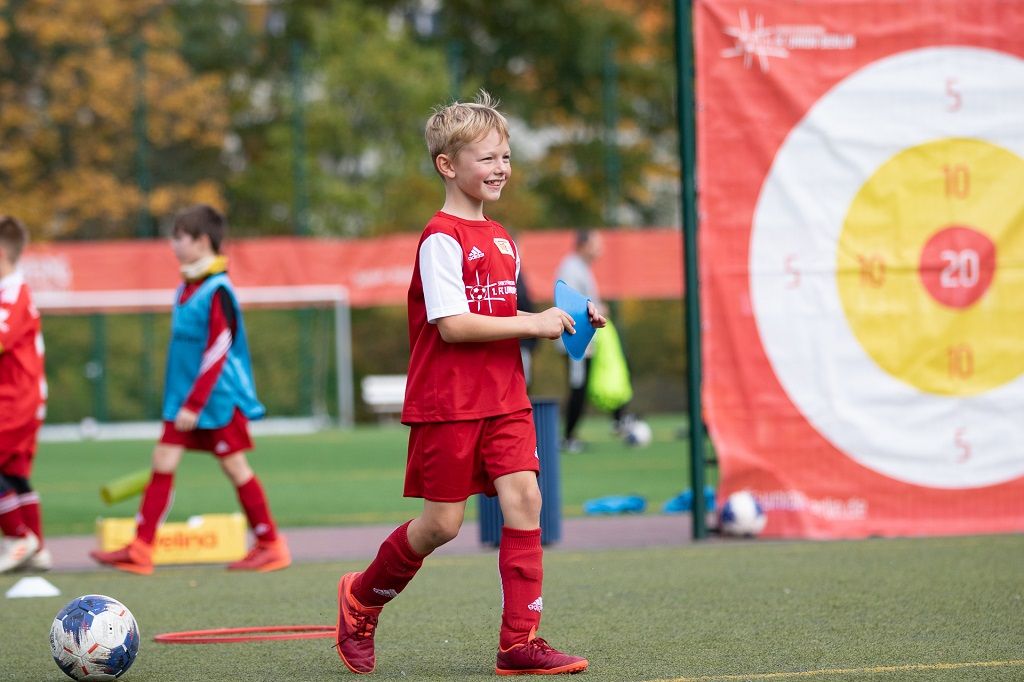 Ein junger Fußballspieler in roter Kleidung lächelt, während er auf einem Platz mit Zielscheibe und anderen Spielern trainiert.