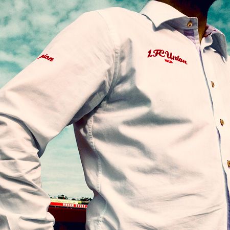 Das exklusive Union-Hemd wird aus einem weißen Hemd des italienischen Labels oTo Milano gefertigt. Manschetten, Kragen und Knopfleiste sind rot-weiß gestreift, die Knopflöcher mit rotem Garn eingefasst. Der rote Schriftzug 1. FC Union Berlin ziert die rechte Vorderseite (Brusthöhe), Eisern Union - ebenfalls rot gestickt – den rechten Ärmel (oben). Rechts unten in die rot-weiße Manschette ist Eisern Union schwarz eingestickt (innen), an gleicher Stelle des linkes Ärmels der Namenszug des Herstellers Hemdenmanufaktur Berlin.