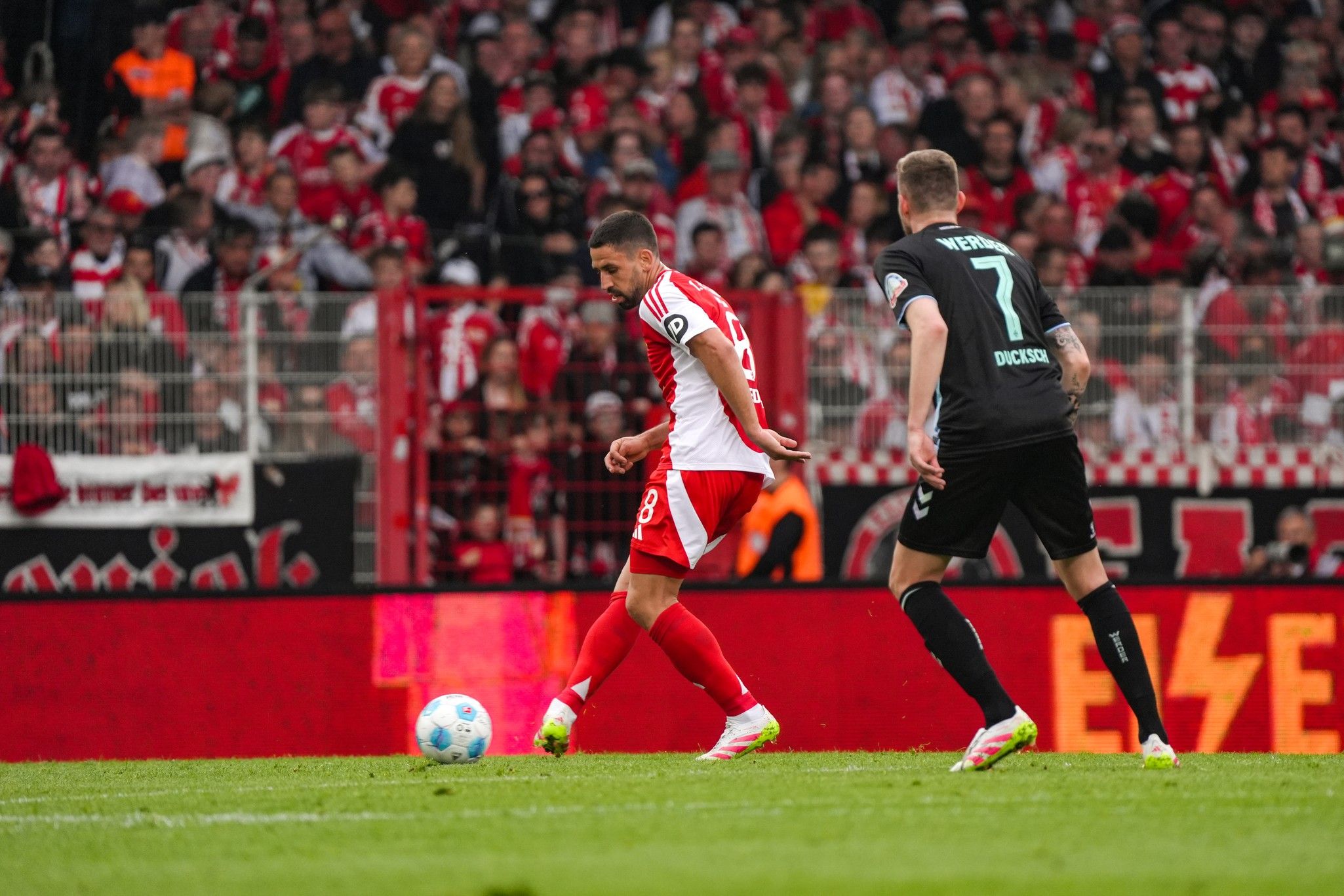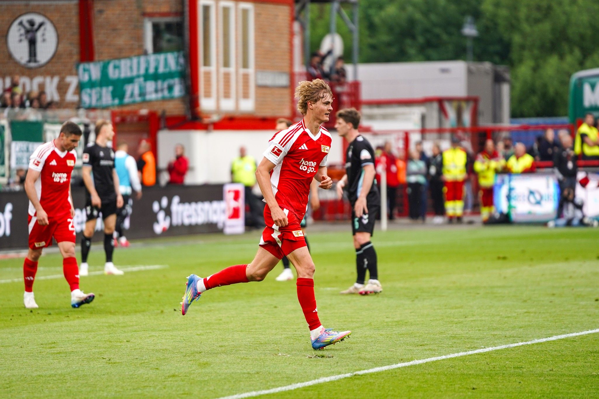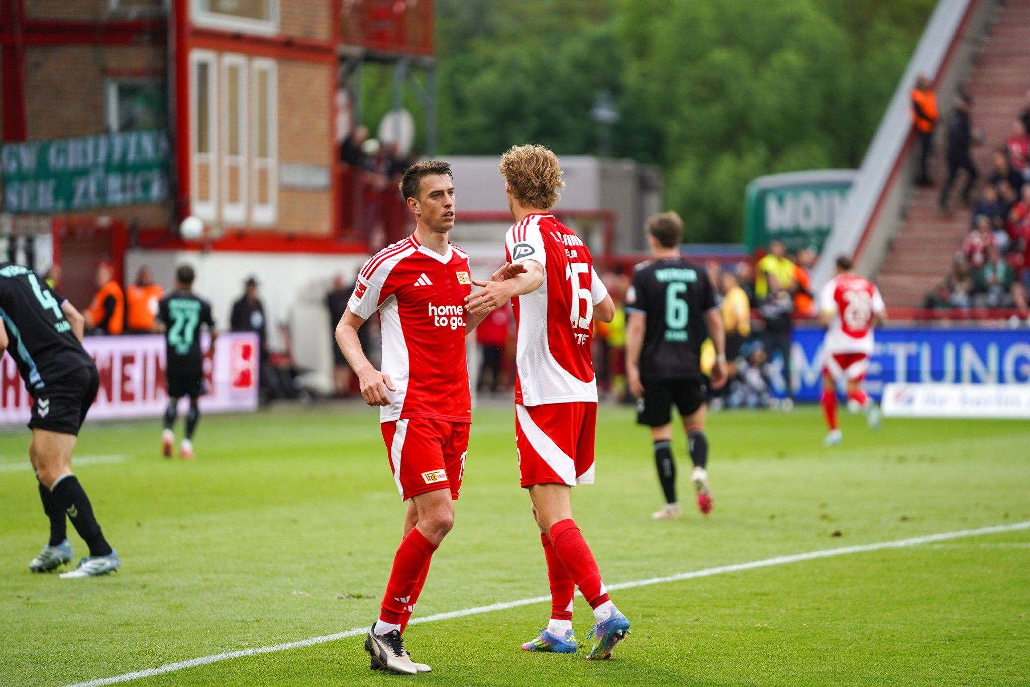 In der Schlussviertelstunde allerdings setzen auch die Eisernen einige Ausrufezeichen, obwohl die Zahlen deutlich für Bremen sprachen. Mit einem schnellen Kurzpassspiel kombinierte sich das Sturmduo aus Benedict Hollerbach und Andrej Ilic in den Strafraum und konnte kurz vor dem Abschluss im Strafraum nur noch durch das kompakte Verteidigen der Hanseaten gestoppt werden. Und so war es wenige Minuten später nicht sonderlich überraschend, dass auch die Hausherren jubeln durften: Danilho Doekhi fing in der gegnerischen Hälfte den Ball ab und leitete ihn direkt an Abwehrkollege Christopher Trimmel weiter. Dessen perfekte Flanke auf den zweiten Pfosten fand am 5-Meter-Raum Tom Rothe, der mit seinem Kopfball Zetterer überspielte und entgegen der Laufrichtung des Keepers den Ball im Tor unterbrachte (37.).