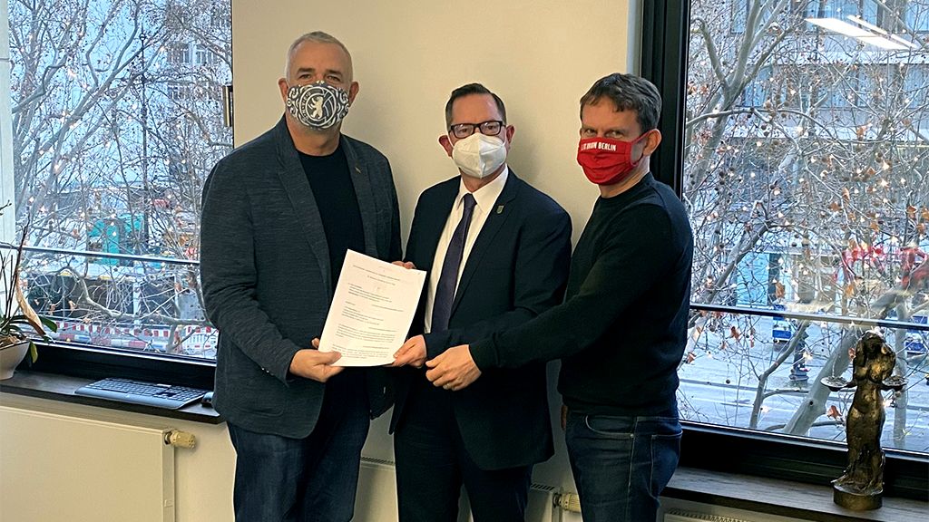 Am heutigen Donnerstag wurde der Erbbaurechtsvertrag für das Gelände des geplanten neuen Nachwuchsleistungszentrums (NLZ) des 1. FC Union Berlin beurkundet. Oliver Igel, Bürgermeister des Stadtbezirks Treptow-Köpenick, Union-Präsident Dirk Zingler und Lutz Munack, Geschäftsführer Nachwuchs- und Amateurfußball, unterzeichneten den Vertrag, der den Eisernen ermöglicht, auf dem Gelände am Bruno-Bürgel-Weg den Grundstein für die zukünftige Heimat der Nachwuchsarbeit zu legen.