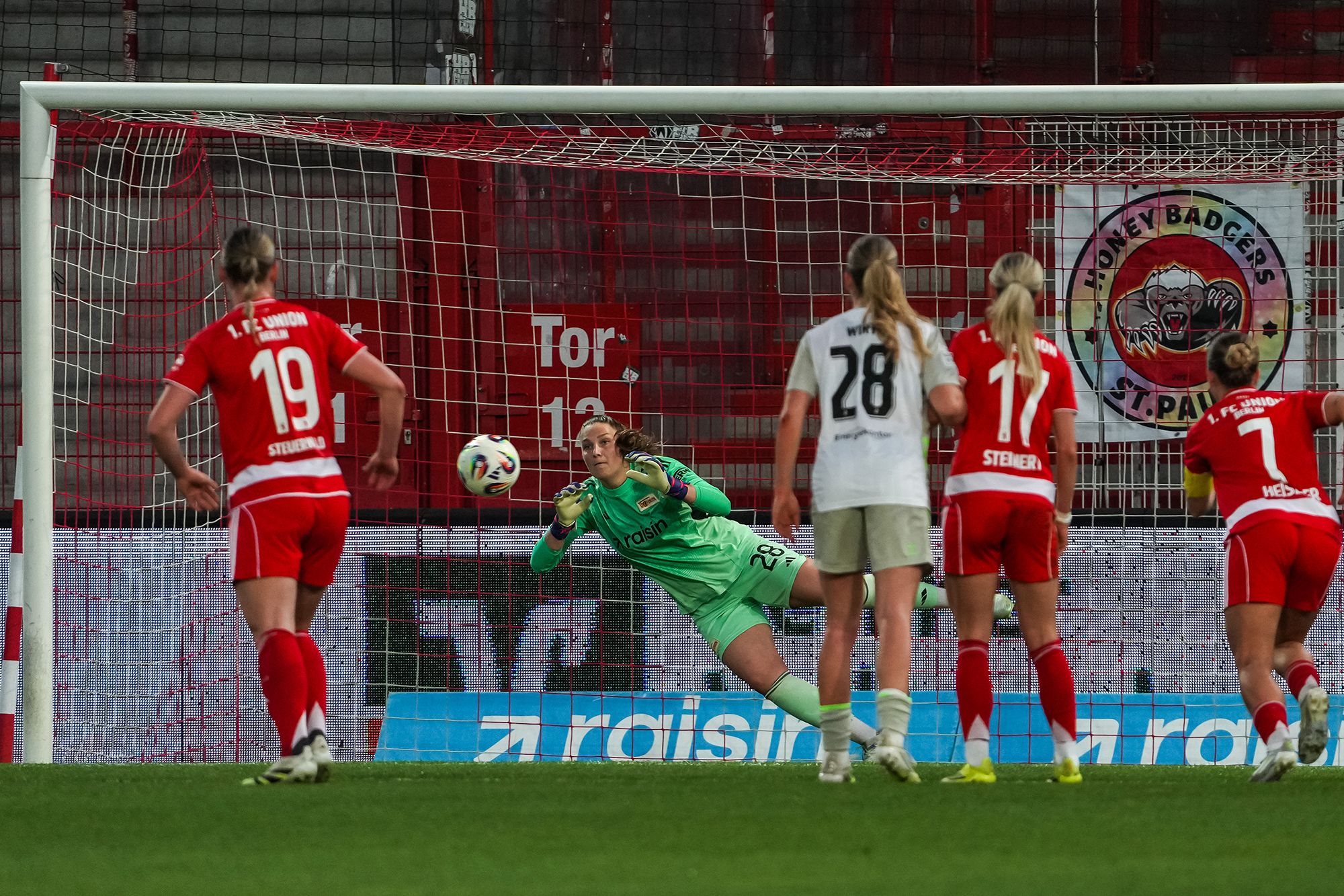 Im Nachgang war das Spielgeschehen von einigen Fouls geprägt und die Teams boten den 6907 Zuschauern wenige gefährliche Strafraumszenen, ehe es in Minute 29 zu einem Handspiel-Elfmeter für die Grün-Weißen kam. Larissa Mühlhaus, die derzeit mit 12 Saisontoren Platz 3 der Torjägerinnenliste belegt, trat vom Punkt an und scheiterte an Böhi, die mit einer doppelten Glanzparade die Union-Führung sicherte.