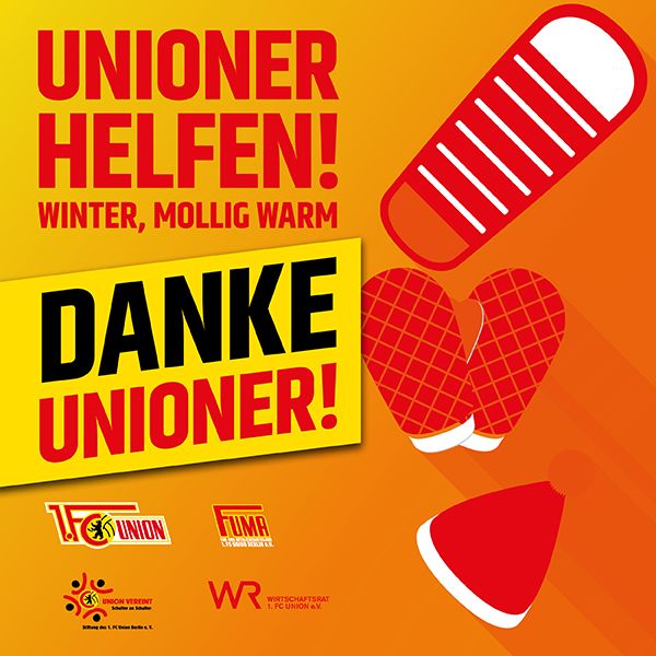 "Winter, mollig warm“ hieß der Aufruf zur Kleiderspende, die auf Initiative der Fan- und Mitgliederabteilung des 1. FC Union Berlin vom Verein gemeinsam mit seiner Stiftung "UNION VEREINT. Schulter an Schulter" und dem Wirtschaftsrat 1. FC Union e.V. Ende des letzten Jahres mit großem Erfolg durchgeführt wurde.
