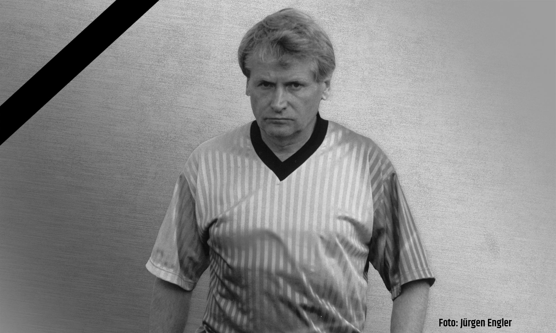 Porträt eines Mannes in einem gestreiften Fußballtrikot, der ernst in die Kamera blickt. Schwarz-weiße Darstellung.