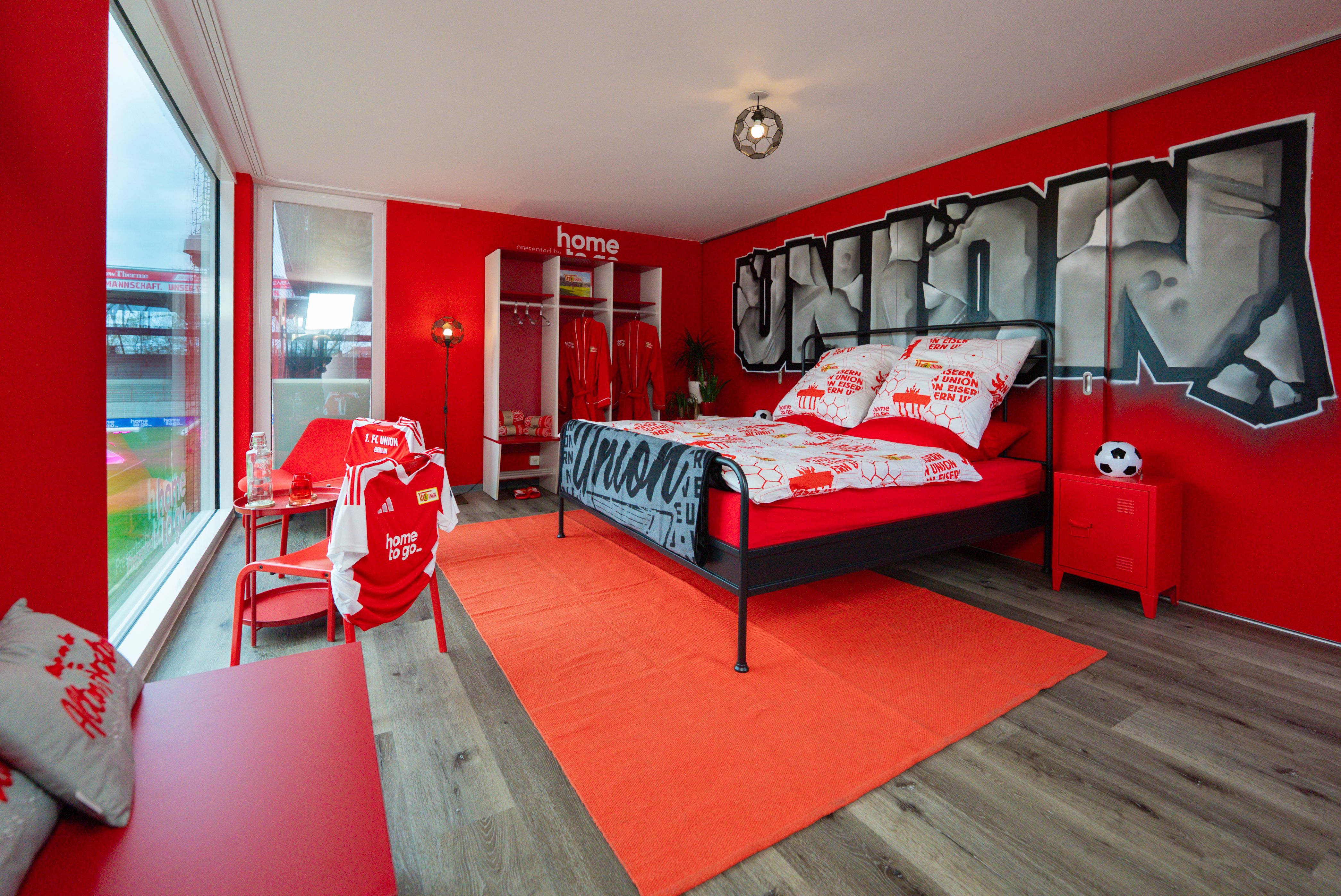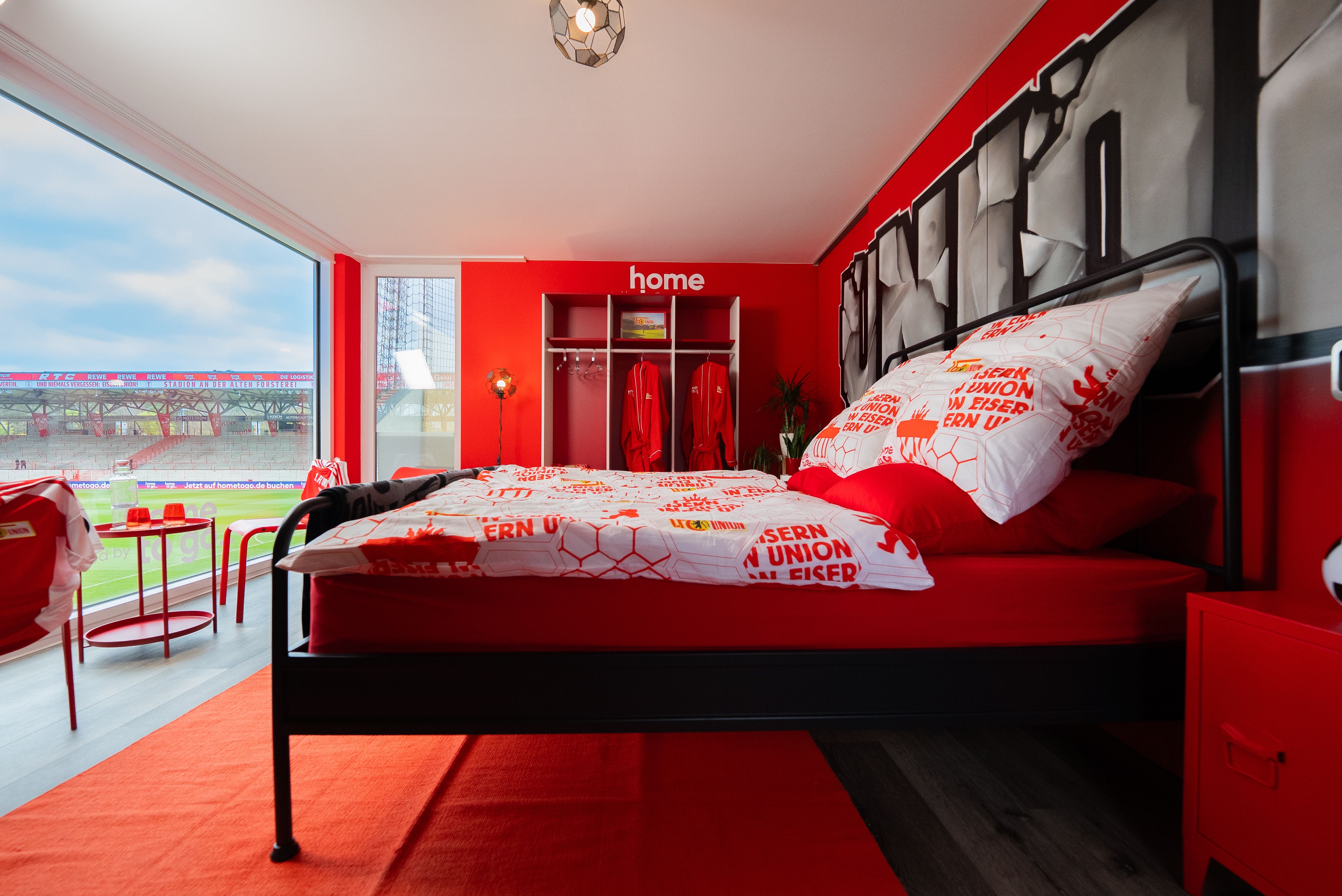 Direkt am Spielfeldrand gelegen, mit Blick auf den heiligen Rasen des Union-Wohnzimmers auf dem die Eisernen in den vergangenen Jahren so viele traumhafte Erlebnisse wie den Aufstieg in die erste Bundesliga, den Klassenerhalt und den Einzug in die UEFA Champions League feiern durften, können Unioner jetzt erneut träumen. Die Unterkunft wurde gemeinsam von Union und HomeToGo gestaltet. Mit bodentiefen Panoramafenstern und einem einzigartigen, speziell entworfenen Design bietet sie eine außergewöhnliche Übernachtungsmöglichkeit, die es so nur auf HomeToGo gibt. Die Unterkunft ist an die Mannschaftskabine der Union-Profis angelehnt und bietet gleichzeitig den Komfort einer Ferienwohnung. Sportlich und gemütlich zugleich! Das ist aber noch nicht alles: Wer nach der Buchungsanfrage ausgewählt wird, im Stadion zu übernachten, wird zusätzlich in den Genuss einer abendlichen Stadionführung und natürlich eines Besuchs des auf die Übernachtung folgenden Heimspiels kommen. Und das Beste: Diese Buchung ist kostenlos.