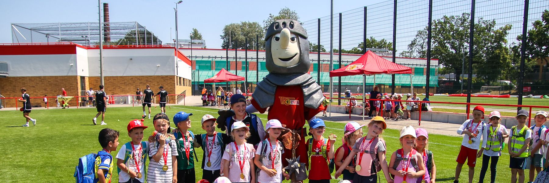 Rote und weiße Stoffe mit dem Aufdruck "UNION BERLIN" in verschiedenen Formen.