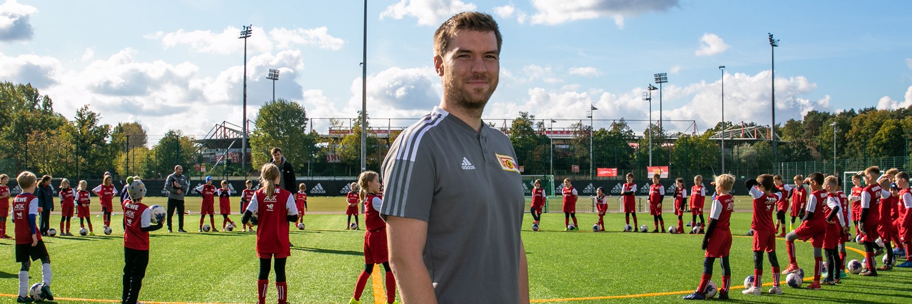 Junger Mann trägt ein schwarzes T-Shirt mit dem Aufdruck "1. FC Union Berlin" und steht vor einem urbanen Hintergrund.
