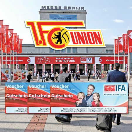 Die Messe Berlin, Partner des 1. FC Union Berlin, wird exklusiv beim Spiel gegen Rasenballsport Leipzig an den Eingängen des Stadions An der Alten Försterei Gutscheine für die bevorstehende Internationale Funkausstellung (IFA) verteilen. Die Gutscheine berechtigen zum kostenfreien Besuch der Messe.