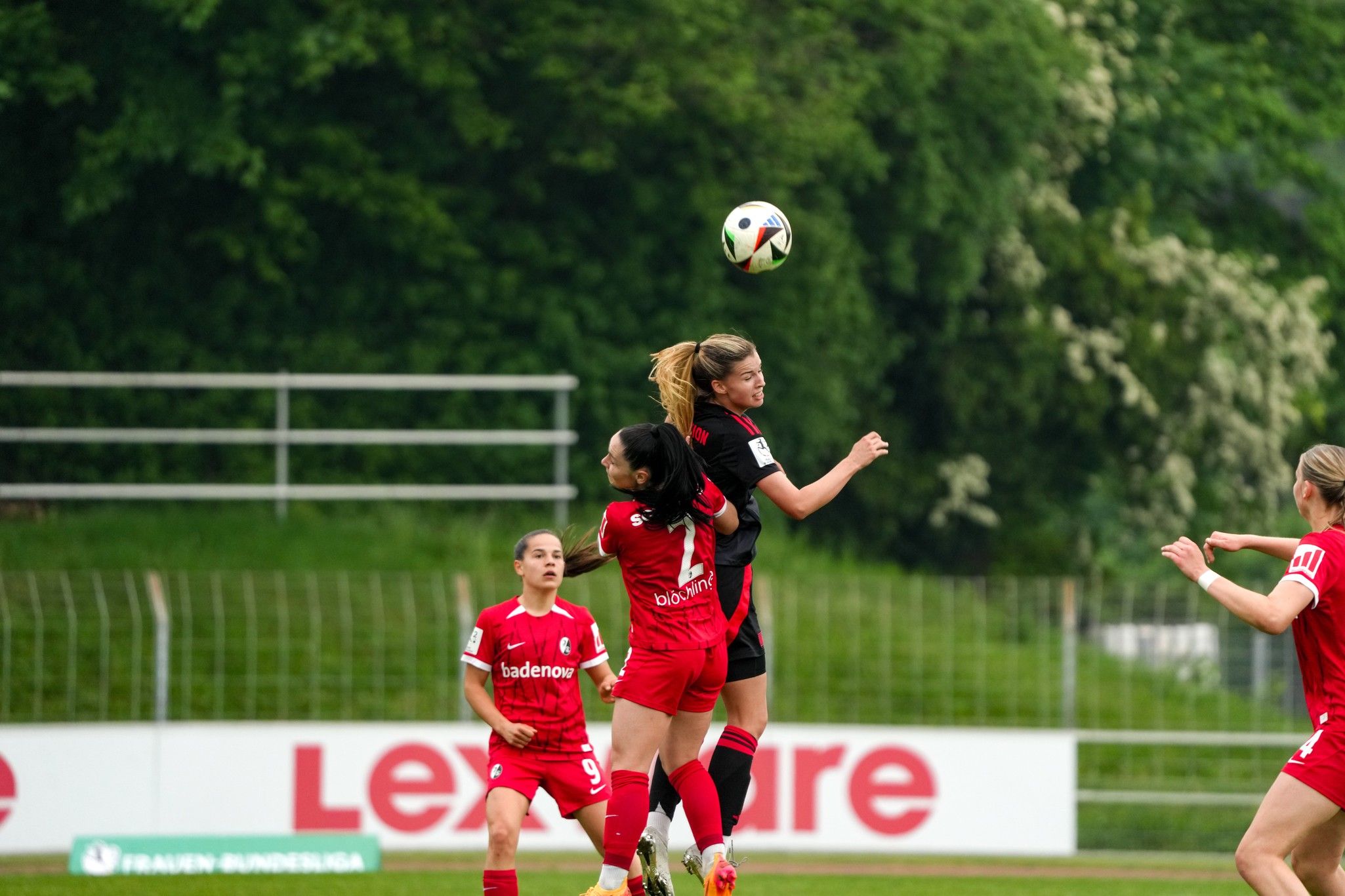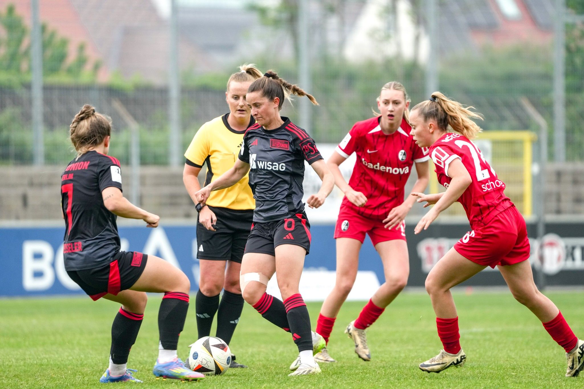 Bereits nach drei Minuten verbuchten die Eisernen Ladies im Breisgau einen Aluminiumtreffer: Nach einer Flanke von Anna Weiß zwang Dina Orschmann die gegnerische Torhüterin Lena Nuding per Kopfball zu einer ersten Parade, ehe Sarah Abu Sabbah den Nachschuss aus sehr spitzem Winkel an den Außenpfosten setzte. Union startete mit viel Elan in die Partie und hatte in der 8. Spielminute die nächste Chance, als Lisa Heiseler nach Zuspiel von Abu Sabbah aus zehn Metern zum Abschluss kam, doch den zentralen Versuch konnte Nuding abermals entschärfen. Eine Minute später war es dann aus Union-Sicht aber so weit: Innenverteidigerin Tomke Schneider schaltete sich unwiderstehlich ins Offensivspiel ein und spielte die Kugel am Strafraumrand flach an den zweiten Pfosten, wo Abu Sabbah angerauscht kam und in ihrem ersten Startelfeinsatz seit dem 6. Spieltag zur frühen Führung traf (9.).