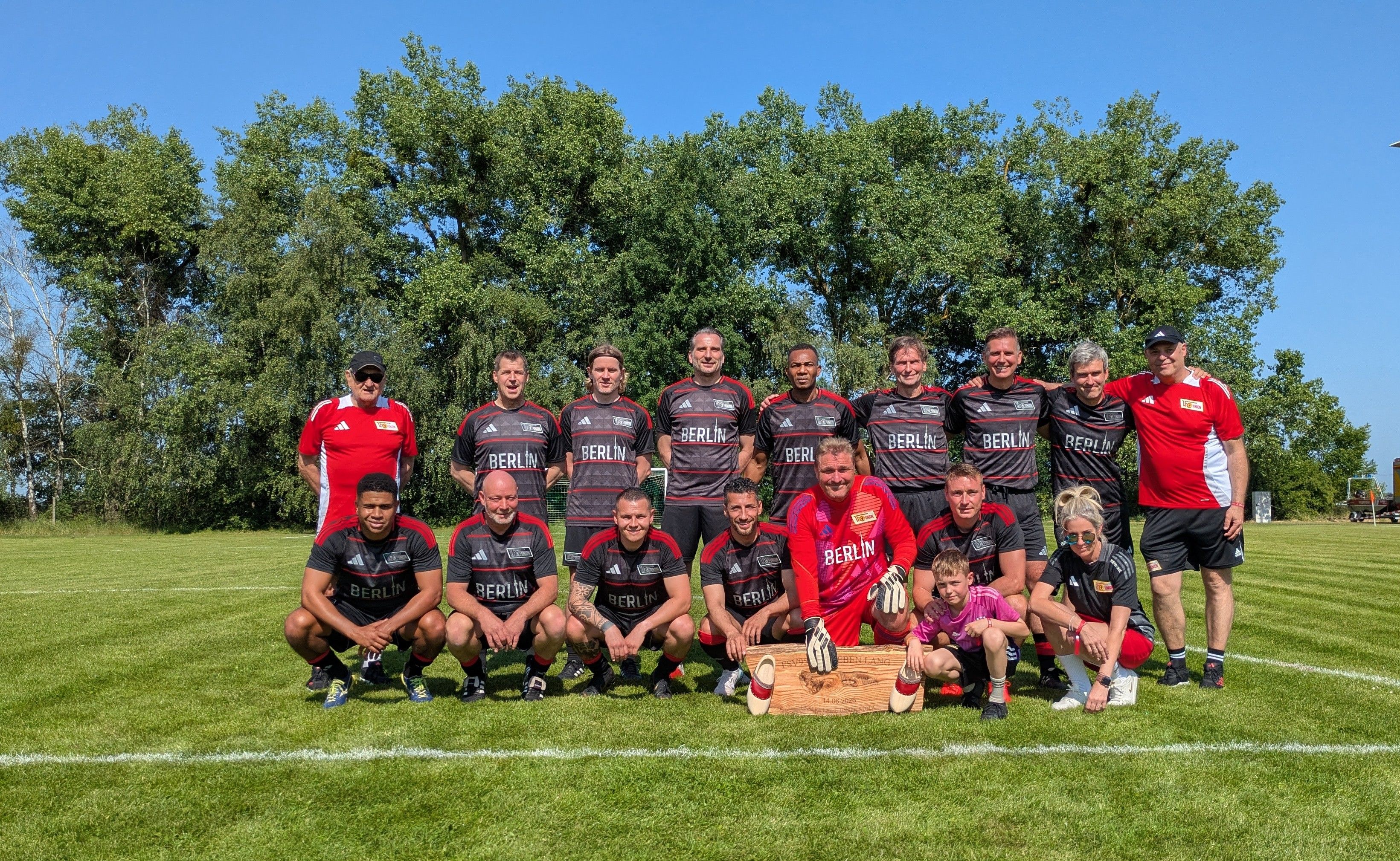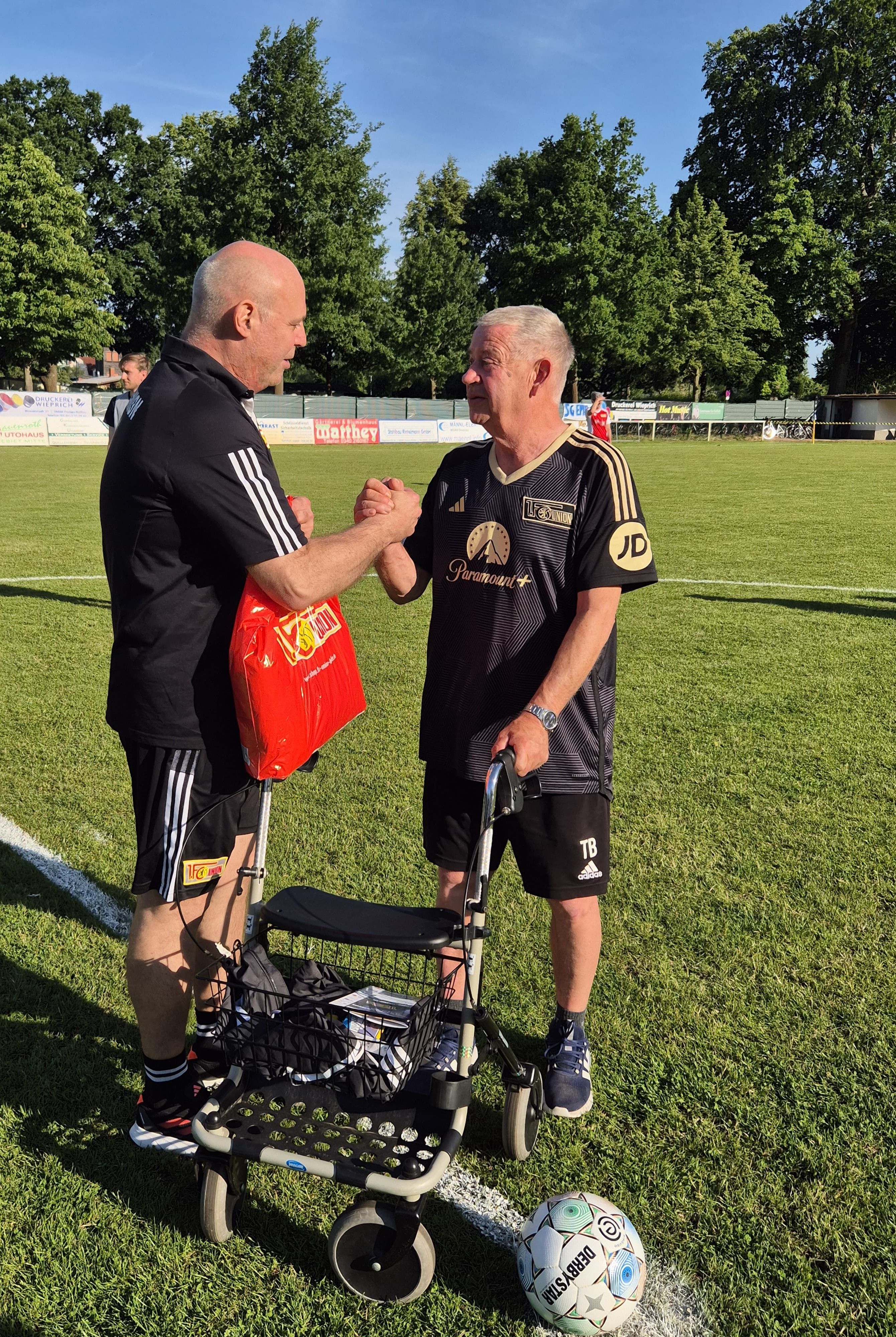 Auf dem Spielfeld wechselten die Eisernen Legenden nicht nur die Trikotfarbe, sondern auch mehr als die Hälfte der Spieler aus. Ganz neu im Köpenicker Team stand Chinedu Ede und als „Methusalem“ des Nachmittags glänzte Peter „Hacki“ Hackbusch mit 66 Jahren wie in besten Zeiten am Ball. Auf der Gegenseite wurde (fast) jeder Männerspieler des Friedrichswalder SV ein paar Minuten eingesetzt. In den 70 Spielminuten waren 34 Spieler des Gastgebers aktiv auf dem Rasen. Die Köpenicker dominierten das Geschehen im ersten Abschnitt ohne Mühe. Die Treffer vor der Halbzeit erzielten dreimal Christopher Quiring, zweimal Karim Benyamina sowie je einmal „Janko“ Schindler, Thomas Boden, Dirk Kamin und Chinedu Ede bei einem unhaltbaren Gegentor das Gastgebers. Mit einer 9:1-Führung versammelte man sich zum „Pausentee“ an der Trainerbank von Dr. Detlef Schwarz.