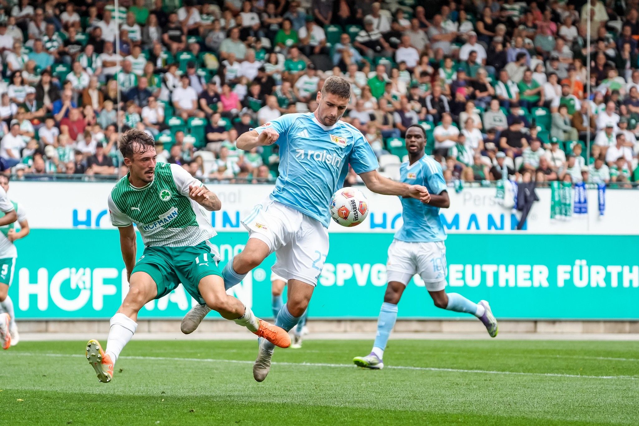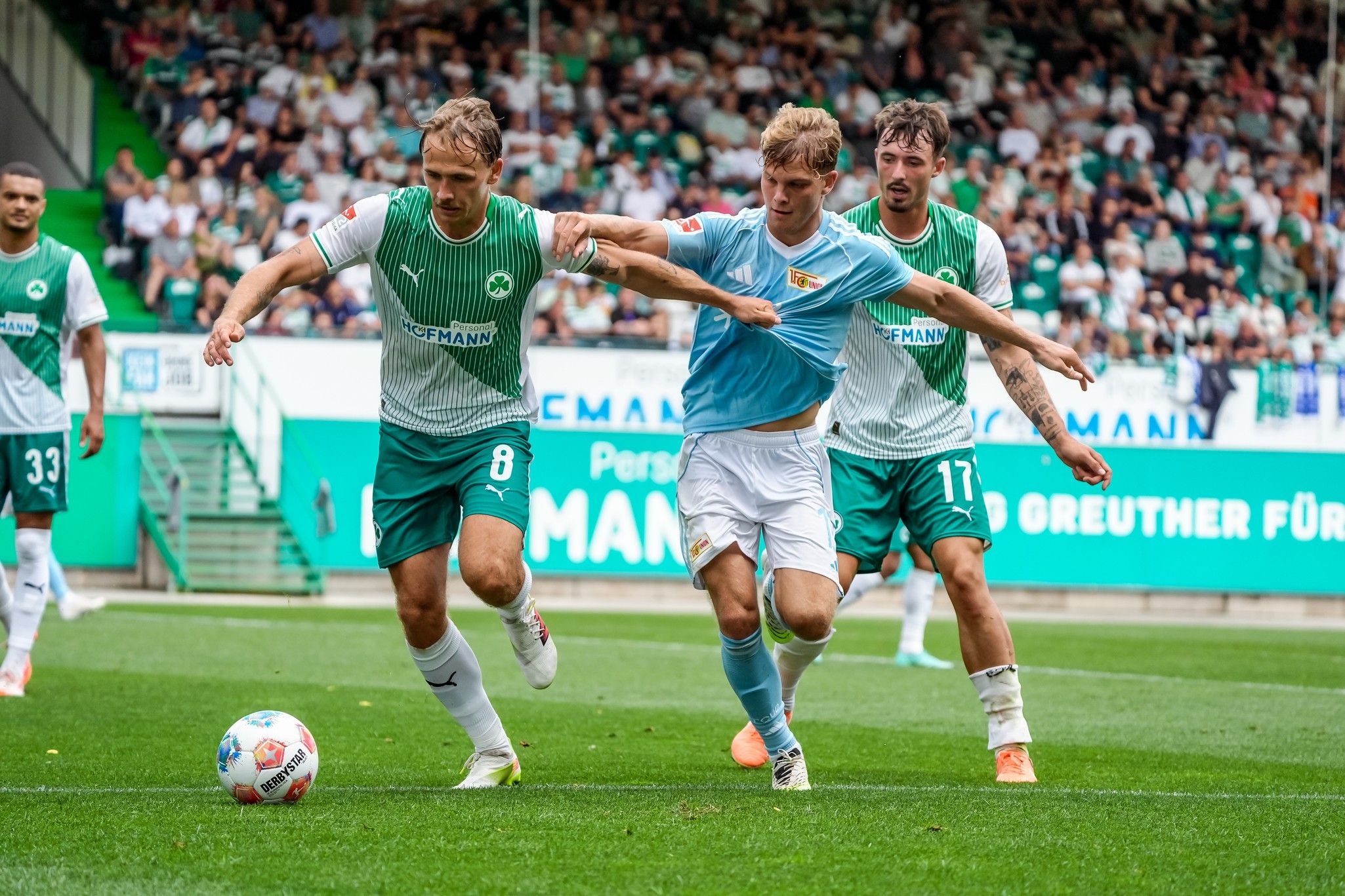 Mit einem wahrlichen Knall begann die Partie nach fast drei Minuten im schwülwarmen Führter Ronhof: Branimir Hrgota wurde per Chip in den Strafraum der Unioner geschickt, nach seiner schnellen Drehung inklusive Abschluss verhinderte nur ein starker Reflex von Torhüter Frederik Rönnow den frühen Rückstand. Das Spielgerät landete am Pfosten und wurde anschließend aus der Gefahrenzone geklärt. Während in der Folge die Eisernen mehr und mehr die Spielkontrolle übernahmen, waren es in der 14. Spielminute erneut die Gastgeber, welche die nächste Chance verbuchten. Jannik Dehm war zunächst auf der rechten Seite durchgebrochen, seine anschließende flache Hereingabe fand auf der anderen Seite Reno Münz. Die Direktabnahme des aufgerückten Außenverteidigers verschwand jedoch in Rönnows Armen.
