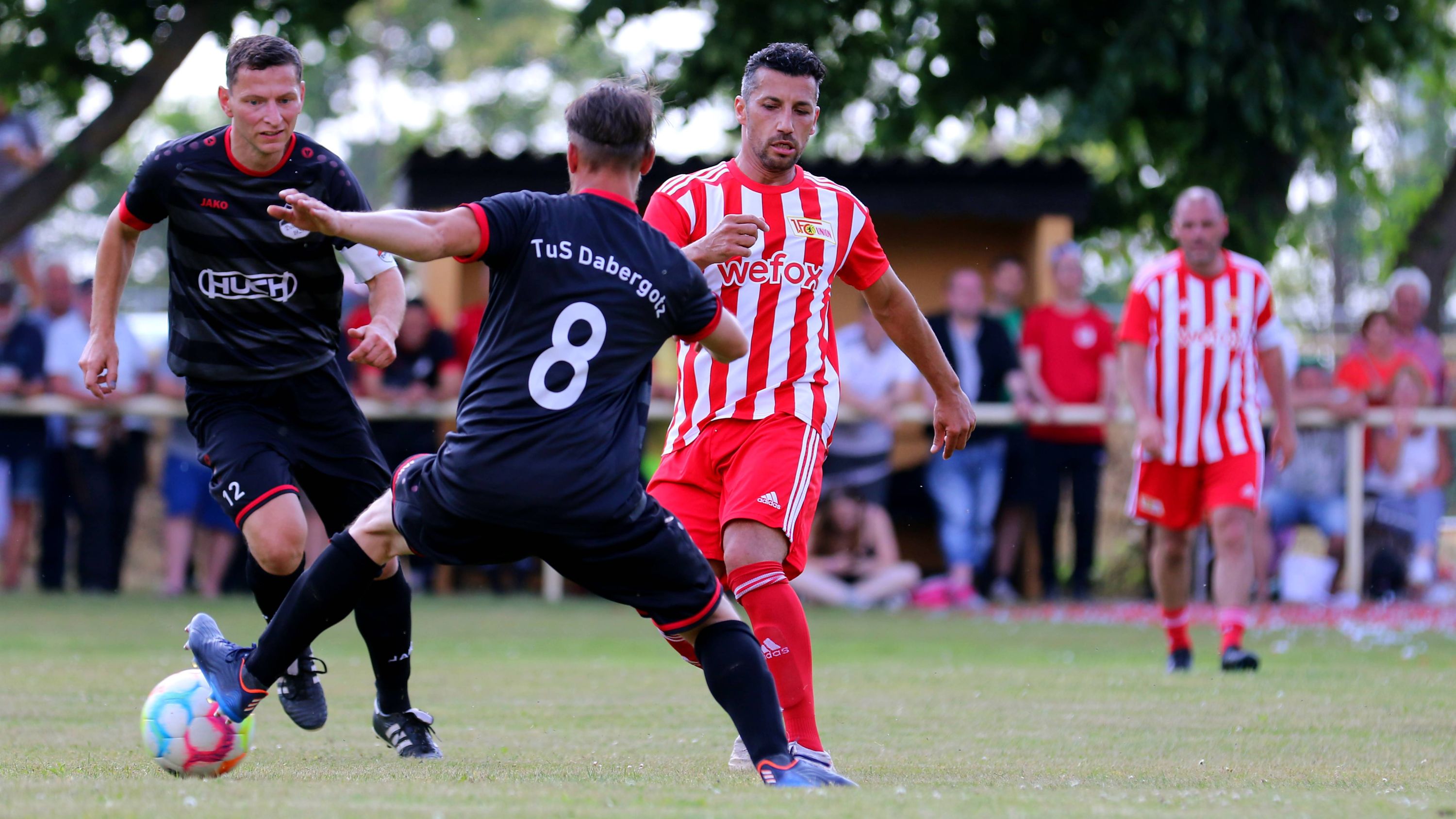 Wiederum lautstark und frenetisch unterstützt vom Union-Fanclub „Eiserne Halunken“ spielten die Männer von Trainer Dr. Detlef Schwarz vor gut 750 Zuschauern groß auf. Mit dem eindeutigen Halbzeitstand von 5:1 wurden die Seiten gewechselt. Verantwortlich hierfür waren mit ihren Toren: Der rot-weiße „Goalgetter“ Karim Benyamina mit seinen Treffern zum 1:0 (10. Minute) und 4:1 (29. Minute), Christian Stuff zum 2:0 (12. Minute), Christoph Menz mit dem 3:0 (16. Minute) und dem schönsten Tor des Spiels, einem sehenswerten Schlenzer in das obere rechte Tordreieck, zum 5:1 (33. Minute). Die TuS Dabergotz witterte mittendrin durch ein Eigentor der Unioner zum 1:3-Anschluss (22. Minute) nur kurz Morgenluft am heißen Sommernachmittag.