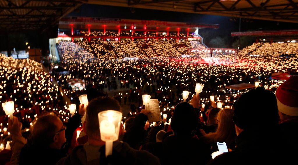 Am Vorabend des Weihnachtsfestes erhellt Kerzenschein das Stadion An der Alten Försterei und 28.500 Unioner singen gemeinsam "Stille Nacht" und "O du Fröhliche".