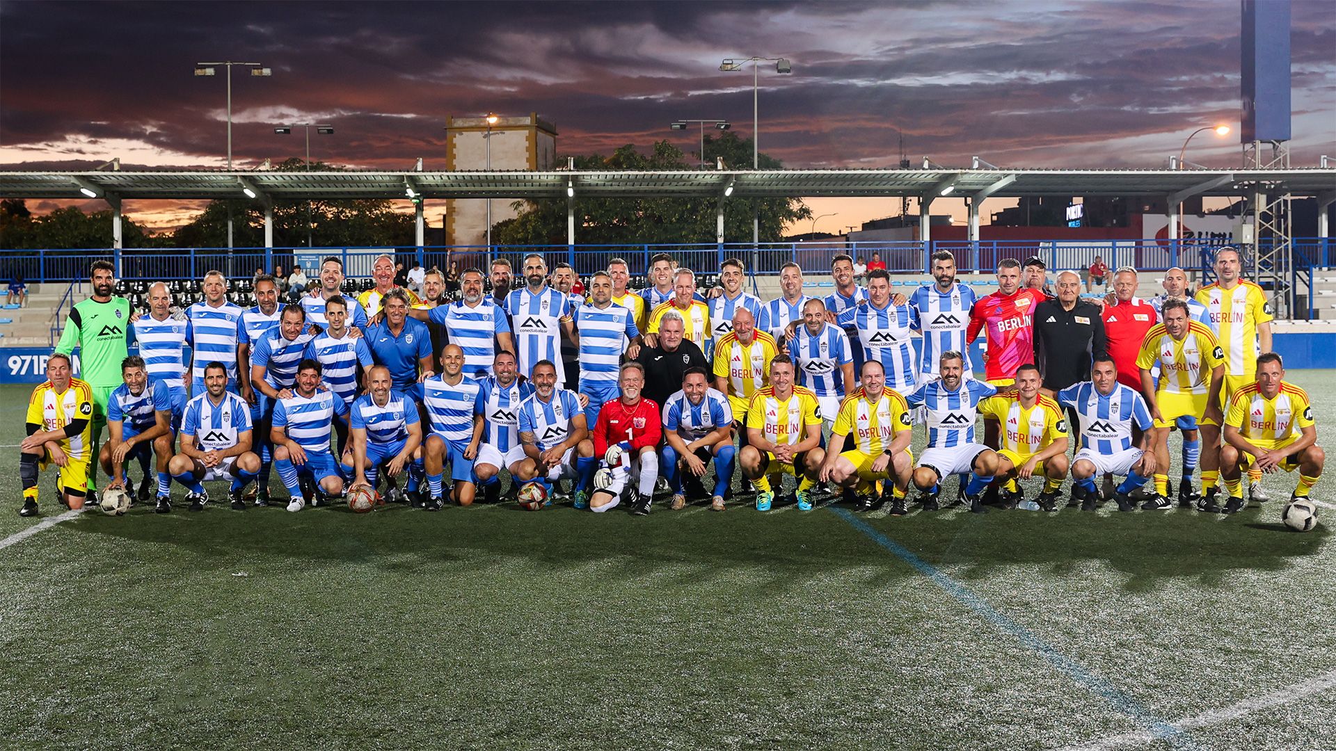 Gruppenfoto von Fußballspielern in zwei Teams, die in blauen und gelben Trikots gekleidet sind, auf einem Spielfeld bei Sonnenuntergang.