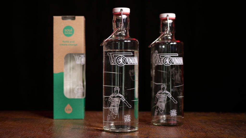 Die sogenannte Soulbottle wurde in Zusammenarbeit mit dem gleichnamigen Berliner Unternehmen gestaltet. Natürlich ist die Flasche, die es im Union-Zeughaus zu kaufen gibt, mit dem Union-Logo graviert. Zusätzlich wurde sie mittels Siebdruck mit einem stilisierten Fußballer verziert.