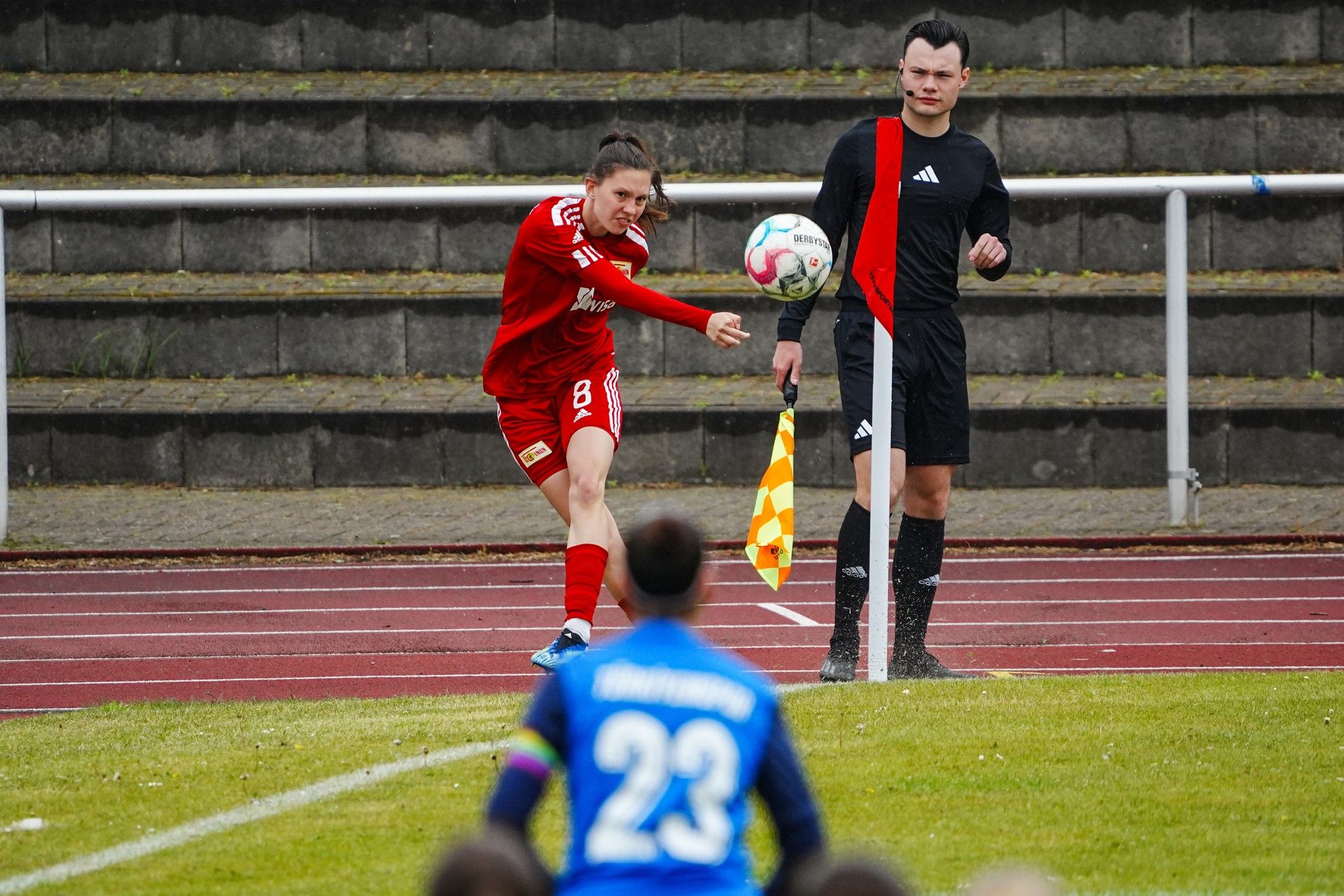 Das Lokalderby im Willy-Kressmann-Stadion fand unter strömenden Dauerregen statt, was den Spielfluss zu Beginn der Partie allerdings keineswegs lähmte. Beide Teams hatten bereits in der Anfangsviertelstunde gute Gelegenheiten, früh in Führung zu gehen. Die erste Chance des Spiels gehörte den Gastgebern aus Kreuzberg, bei denen einige Ex-Unionerinnen im Kader standen, doch Zahraa Chahrour schoss das Leder aus zehn Metern knapp am Kasten vorbei (3.). Auf der Gegenseite hatte Sandra Weihmann nach einer Hereingabe von Louisa Kähler den Führungstreffer auf dem Fuß, zielte aus fünf Metern jedoch ebenfalls am Gehäuse vorbei (9.). Drei Minuten später setzte Hannah Kratz mit einem Traumpass Megan Reichenbach in Szene, die jedoch frei vor dem Tor verzog (12.).