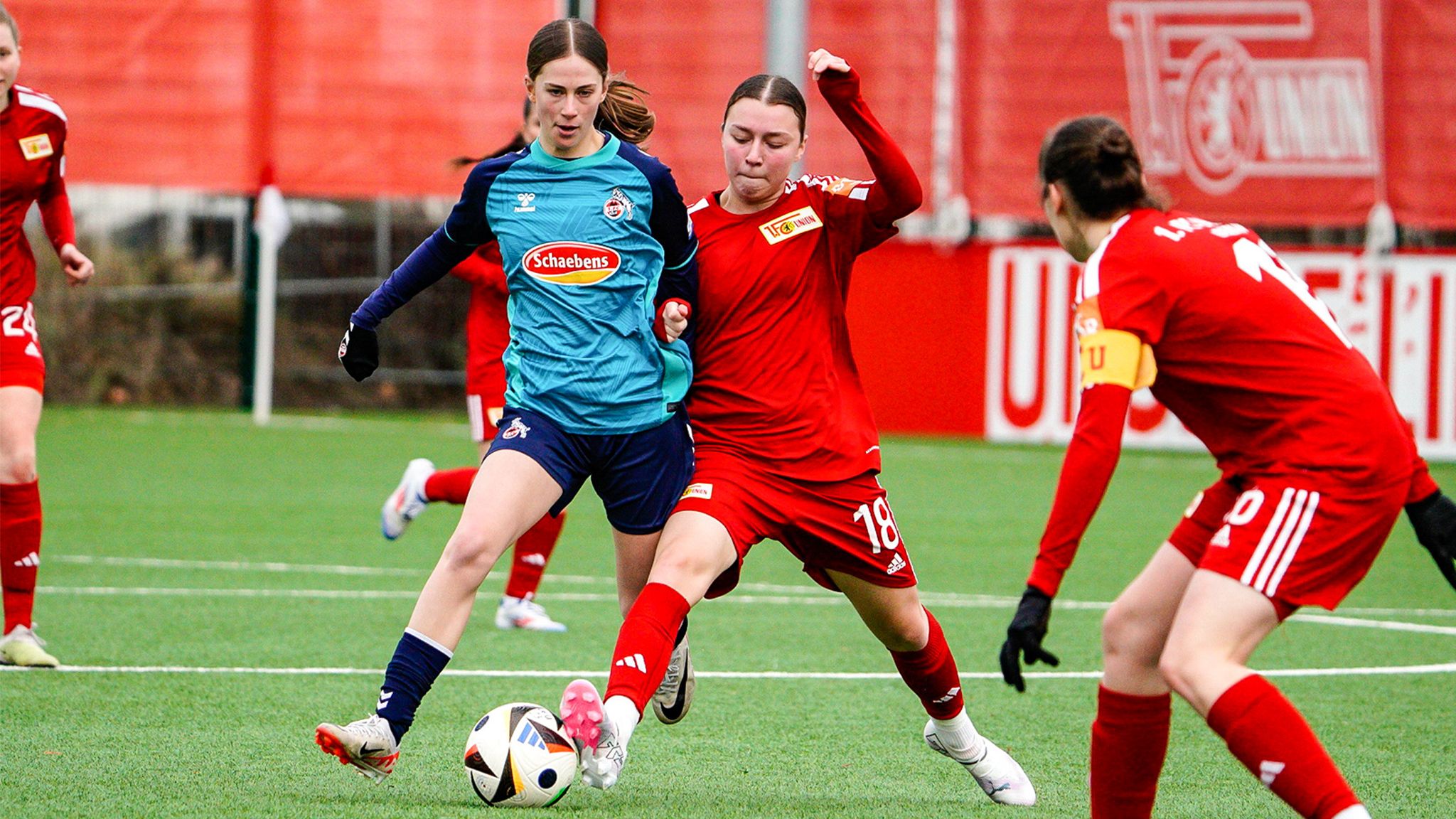 Im Trainingszentrum Oberspree gelang den Unionerinnen durch Elisa Spolaczyk ein Blitzstart: Nach einem Ballgewinn an der Mittellinie setzte Lina Krauss die Mittelstürmerin per Steilpass in Szene, welche die Torhüterin abgezockt umkurvte und den Ball ins leere Tor schob (4.). Insgesamt waren die Kölnerinnen, die in der Regionalliga West auf dem 9. Tabellenplatz stehen, allerdings die etwas aktivere Mannschaften und prüften Union-Schlussfrau Sarah Hornschuch im Verlauf des ersten Durchgangs einige Male.