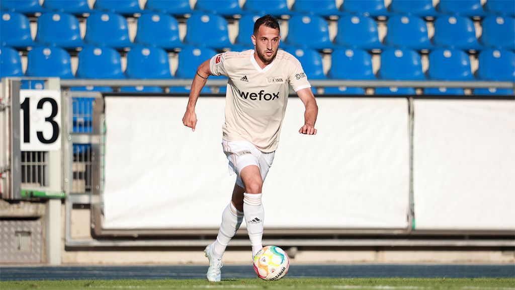 Ein Fußballspieler in einem beigen Trikot sprintet über das Spielfeld, während er auf die Kamera zusteuert.