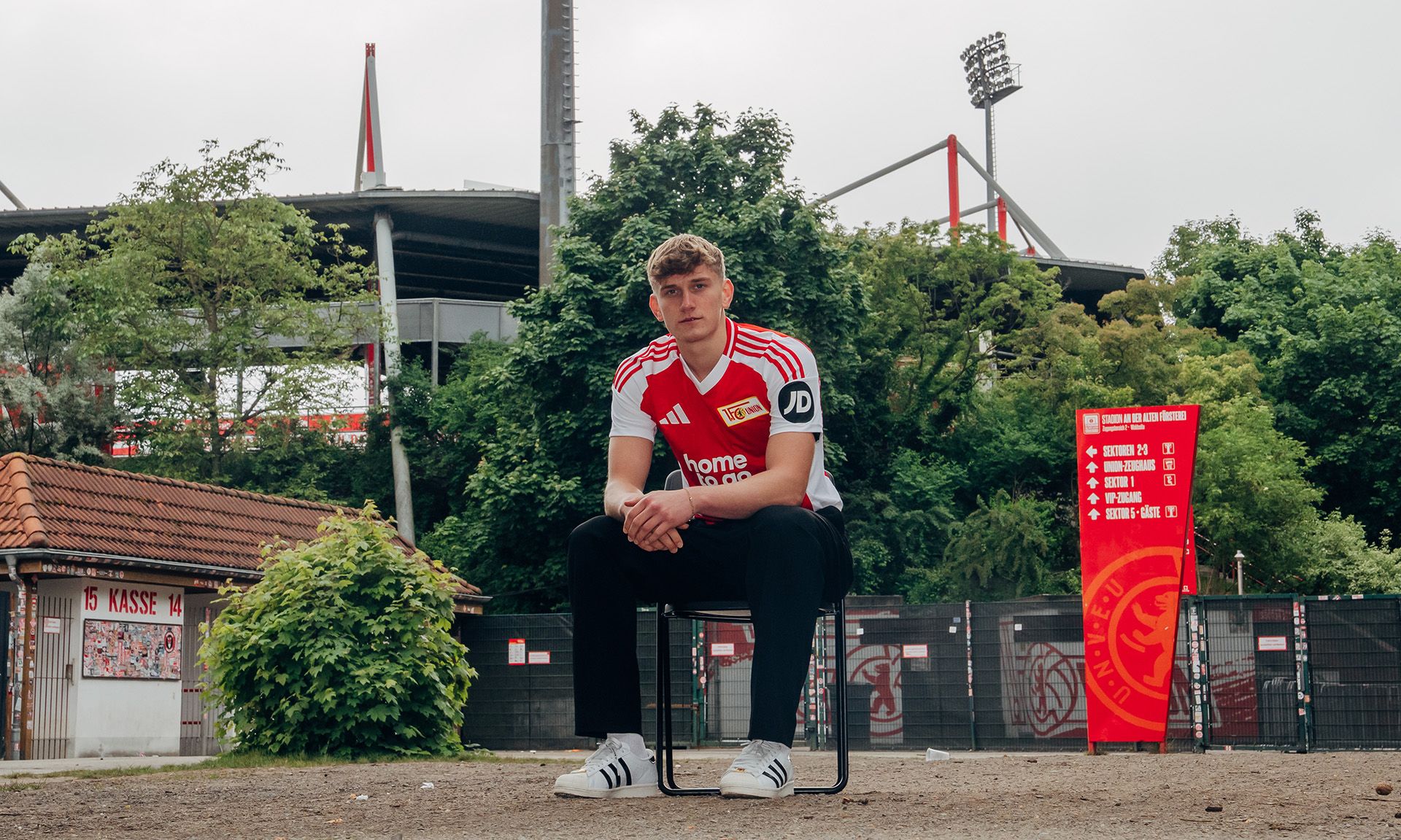 Junger Mann trägt ein schwarzes T-Shirt mit dem Aufdruck "1. FC Union Berlin" und steht vor einem urbanen Hintergrund.
