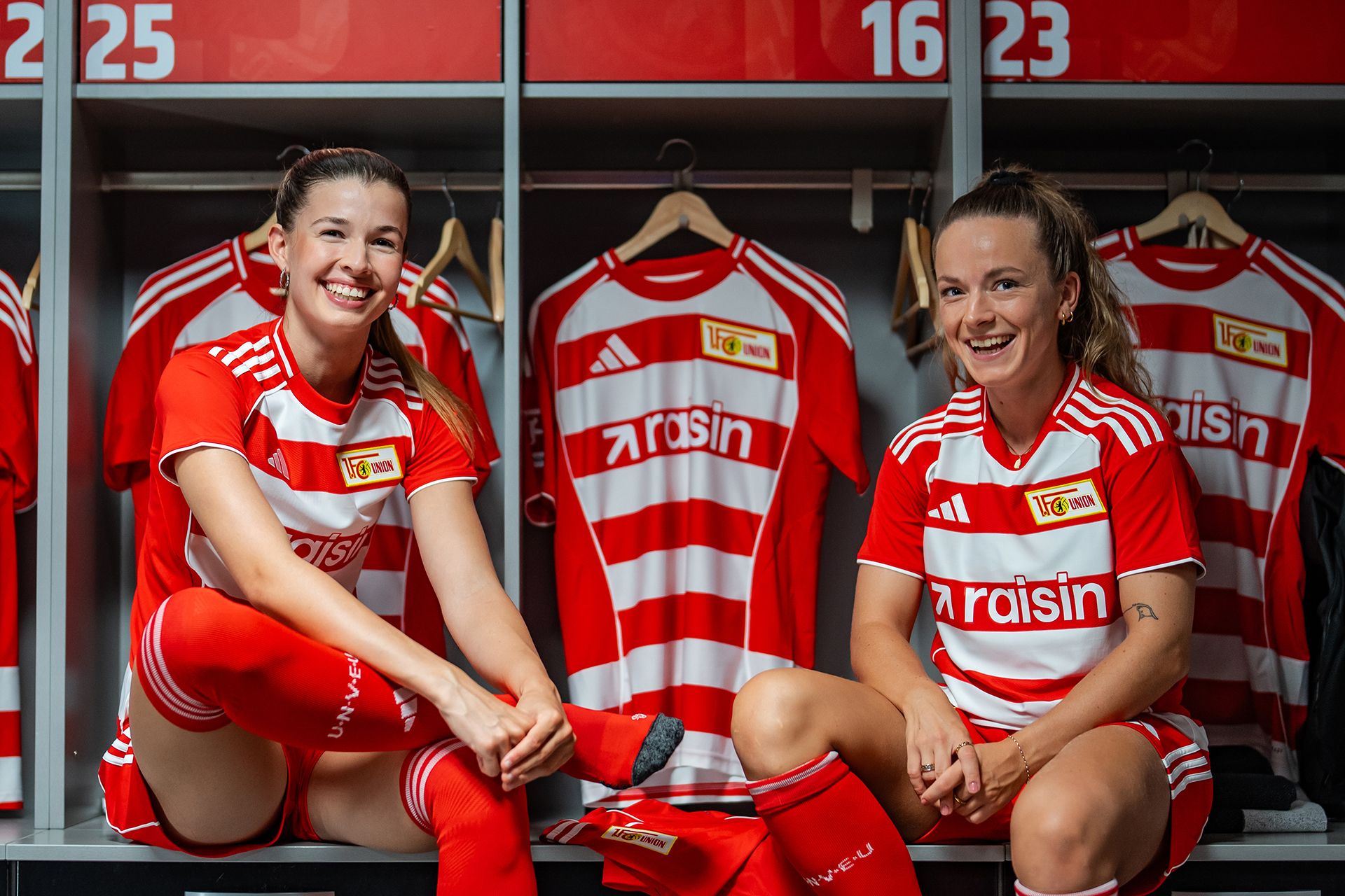 Die klassischen Streifen werden durch ein Kragen- und Ärmel-Design ergänzt, das in kräftigem Union-Rot gehalten ist. Die Vorderseite des Trikots trägt das gewebte Union-Emblem, das Logo von Ausrüster adidas und den Schriftzug des Hauptsponsors Raisin. Im Nackenbereich findet sich der Schriftzug „UNVEU“ wieder. Komplettiert wird die Spielkleidung durch rote Hosen und rote Stutzen.