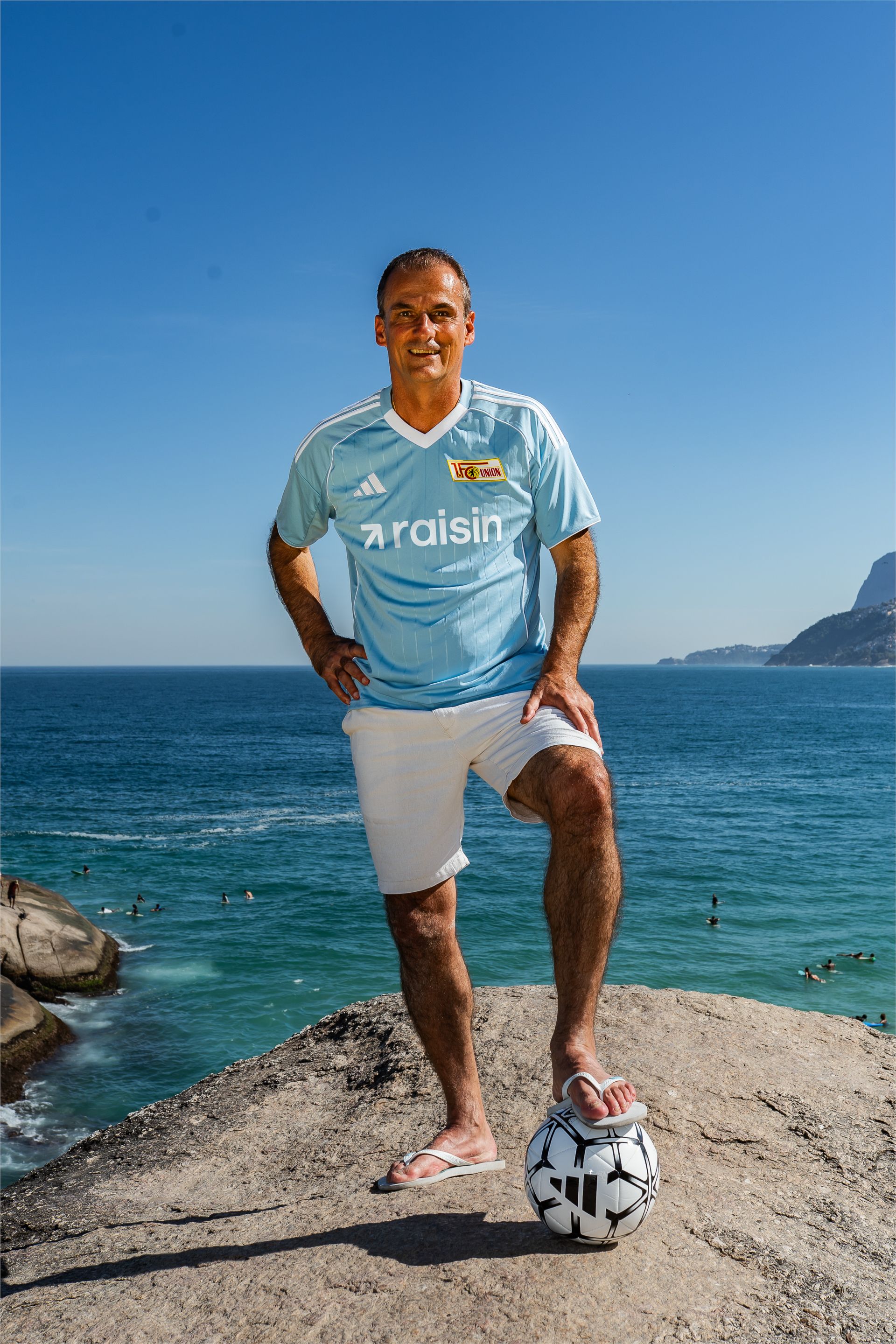 Mit dabei: Der legendäre brasilianische Stürmer Daniel Teixeira. „Texas“, so sein eigentlicher Name an der Alten Försterei, erzielte für Union 67 Tore in 78 Pflichtspielen, zweimal stieg er mit Union in eine höhere Liga auf. Nun präsentiert er gemeinsam mit ehemaligen Mitstreitern das von adidas neu interpretierte Design eines Trikot-Klassikers.