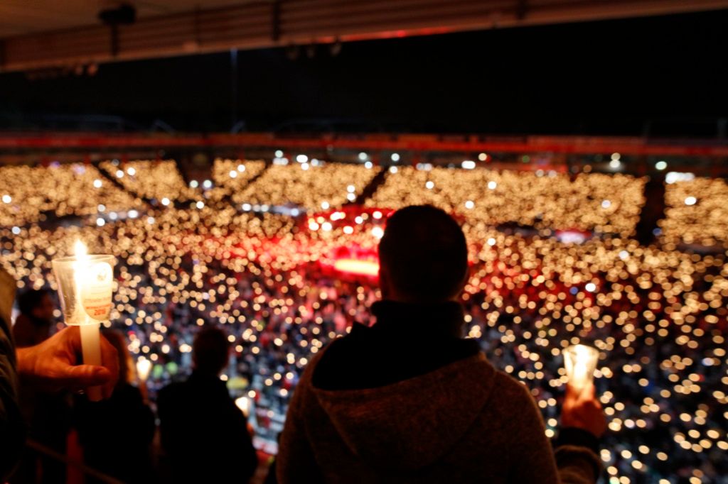 Mit etwas Verspätung wurde um 19:15 Uhr das Flutlicht im Stadion ausgeschaltet, die Hymne der Köpenicker erklang und tausende Kerzen flammten auf.
