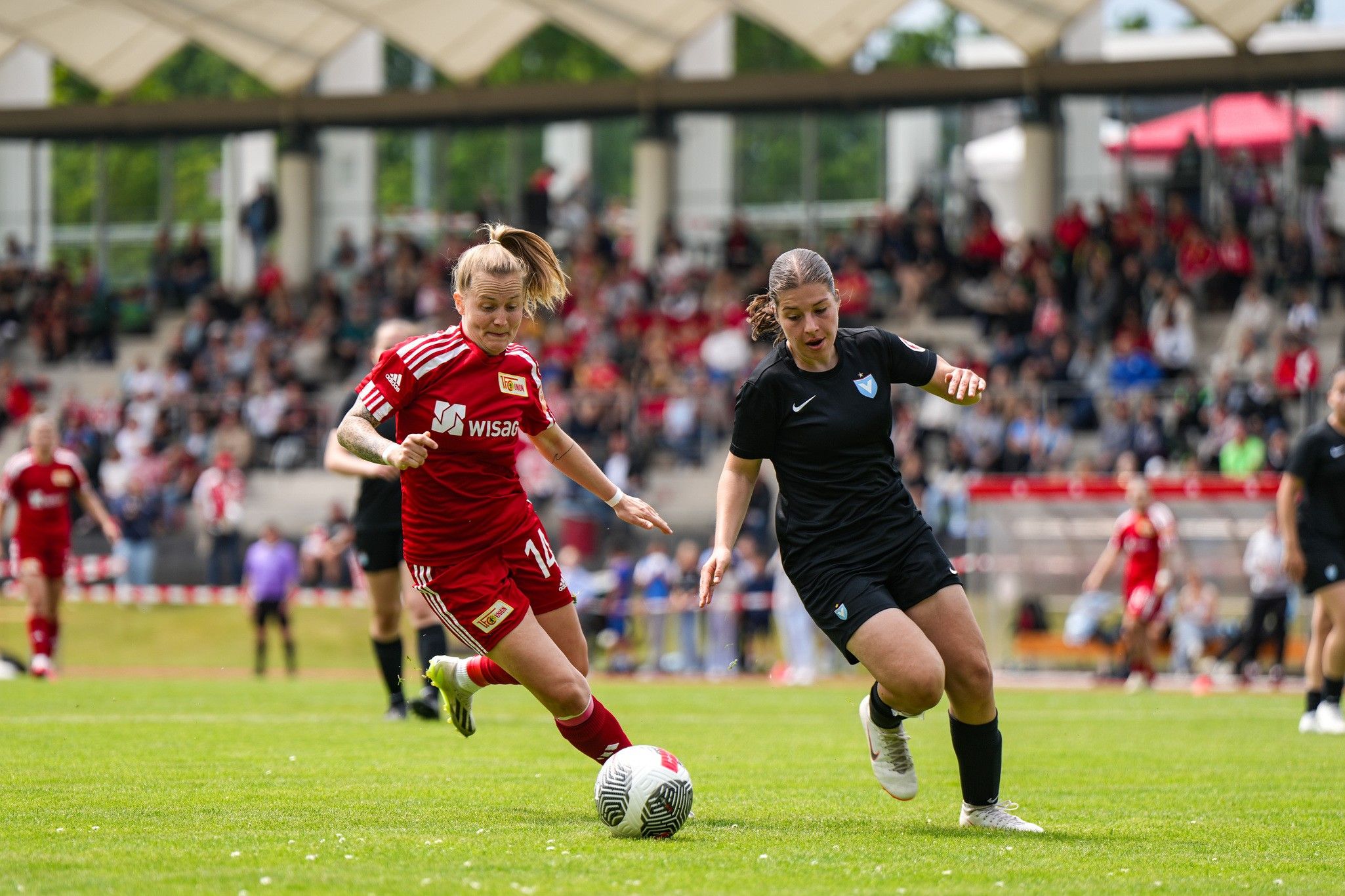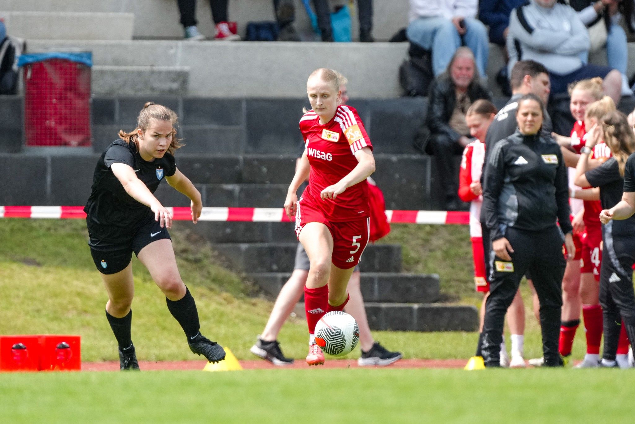 Wiederum nur eine Minute später legte Kratz sehenswert für Union nach: Aus 20 Metern schlenzte die Mittelfeldspielerin das Spielgerät maßgenau in den Torwinkel. Den nächsten Treffer hatte Louisa Kähler auf dem Fuß, deren Versuch nach Zuspiel von Reichenbach jedoch im letzten Moment noch abgeblockt wurde (28.). Sechs Minuten später durften die Rot-Weißen dann wieder jubeln: Krauss brachte den Ball von der Strafraumkante eiskalt per Volley im Netz unter (34.). Ähnlich sehenswert wie die die vorherigen beiden Treffer sollte auch das 4:0 in der 45. Minute werden: Latoya Bach schlenzte das Spielgerät aus 16 Metern ins lange Eck.