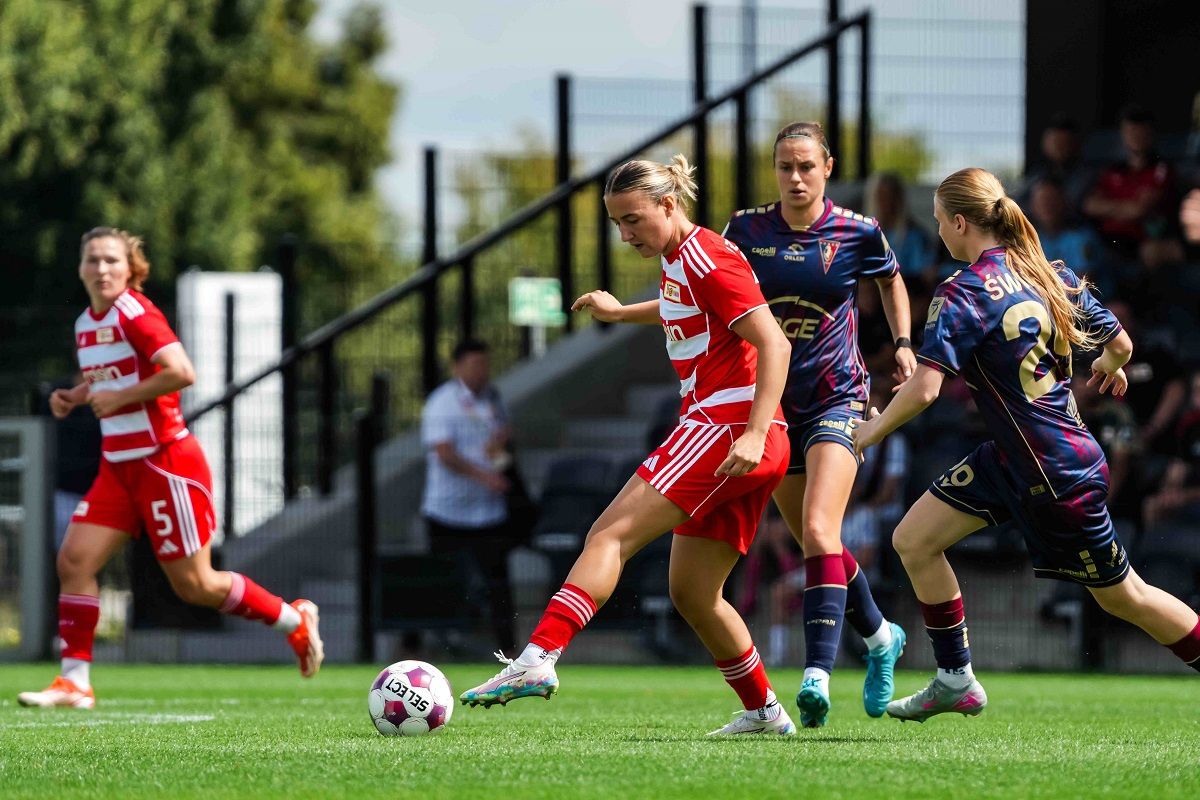 The fourth duel between the two teams within the last two years was opened by Union’s women. They started with a lot of pressure and drive forward into the match, and so Sophie Weidauer had the first shot of the game - which, however, was too central for the goalkeeper of the Polish champions 2024. The second good opportunity for Union’s women was a Schneider cross from the right, which, however, found no recipient in the penalty area (9.). The dominant guests set further offensive accents as a result of a free kick by Judith Steinert, which Eileen Campbell could not convert efficiently (13.). After a corner kick (17.), Tomke Schneider's header landed safely in the hands of the opposing goalkeeper Radkiewicz. The first opportunity for the hosts arose from a long-range shot by Alexis Legowski (21.), where Union’s goalkeeper Cara Bösl was tested and confidently parried the ball out of play.