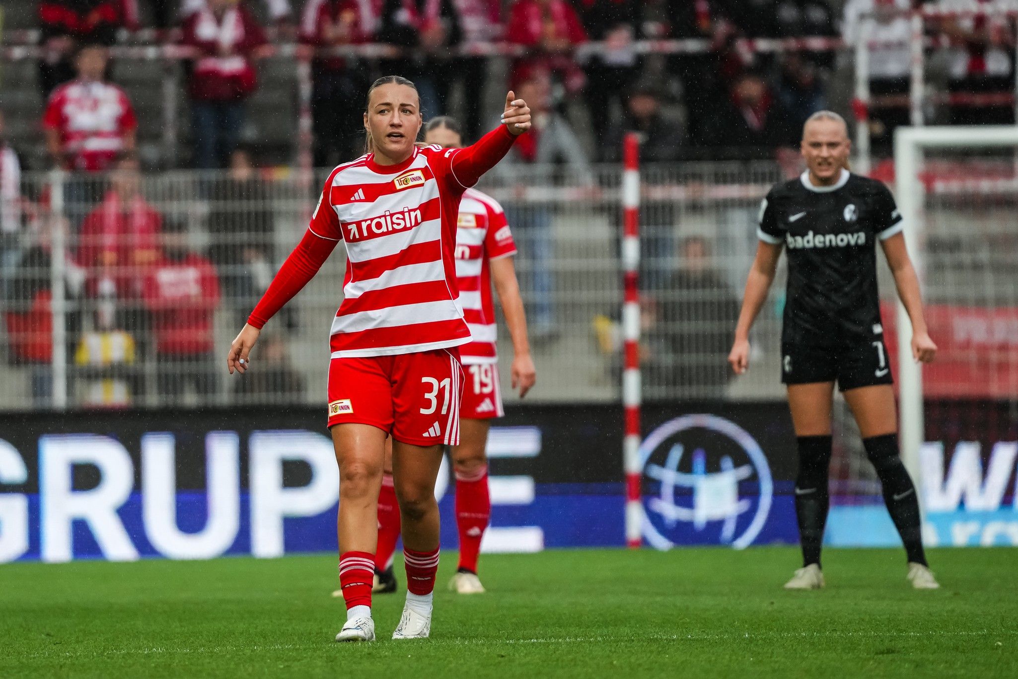 But nothing could be taken for granted against a Freiburg side who finished fifth last season - when Samantha Steuerwald and Eileen Campbell were in black, instead of the red and white now on their backs. Lisa Kolb crashed a shot off the base of Cara Bösl’s post after ten minutes as the rain started to fall. It was a sign of things to come as Freiburg started to take control of the game.