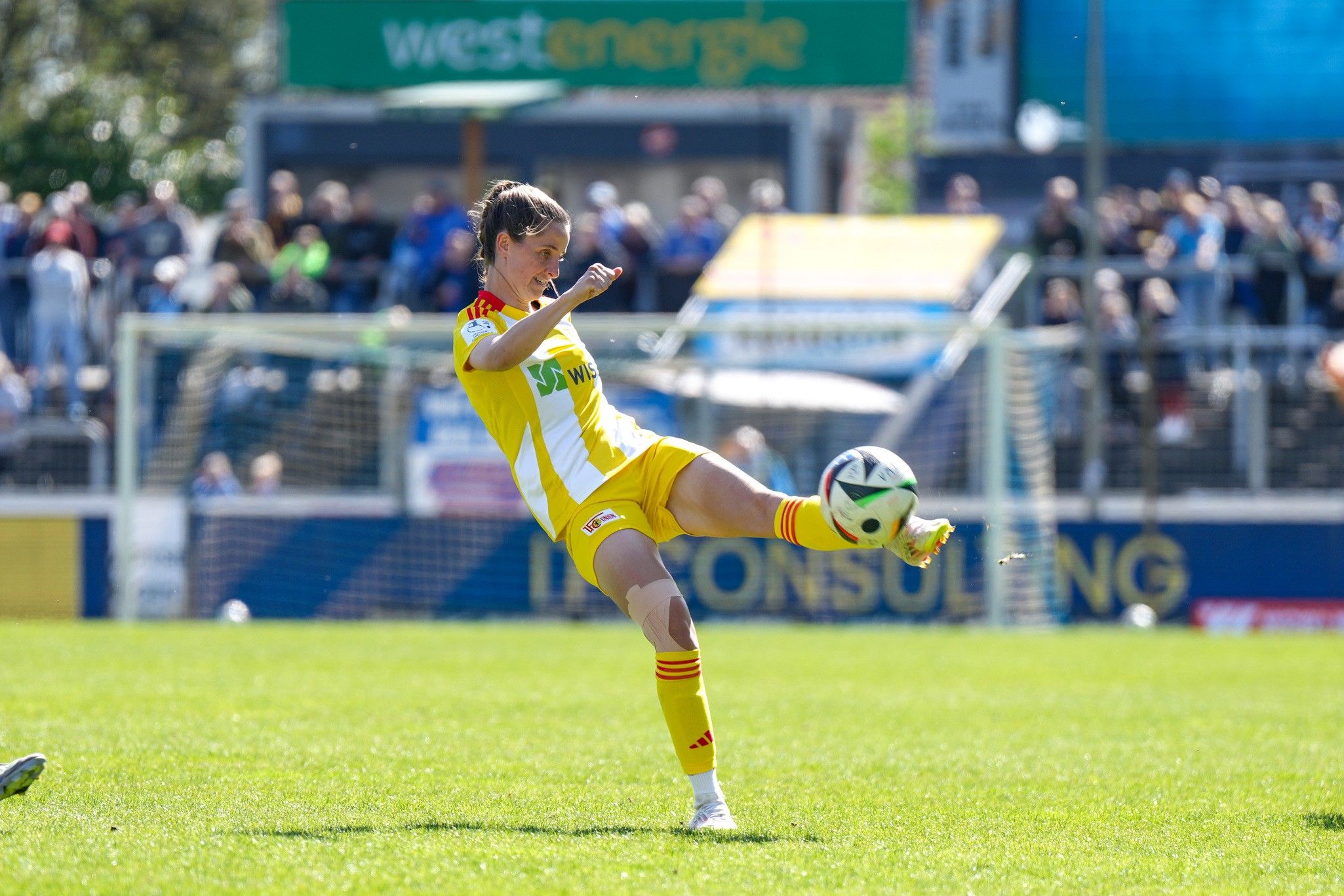 With 60 minutes played, Ailien Poese made her first changes, bringing Charleen Niesler and Sarah Abu Sabbah on for Becker and Halverkamps, but by now Union were sitting a little deeper, taking less to chance. Moraitou and Frank were getting stuck in, her elbows out. Heiseler was floored as she went into a 50-50 challenge 25 yards out from Union’s goal.  Still, Lena Göppel had to be watchful with the top scorer of all the Regionalliga now permanently on her shoulder, then as Reissner brushed her aside, charging towards goal with just over ten minutes to play.