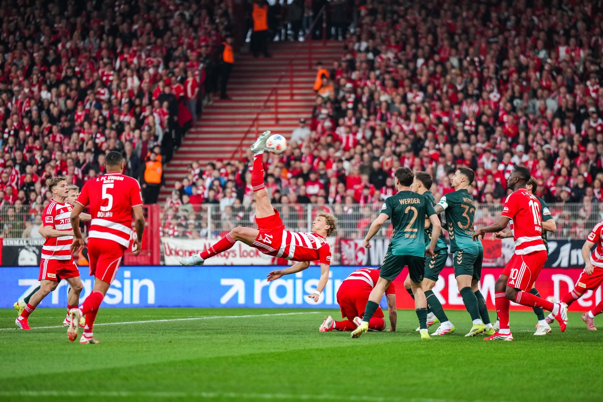 Union were fearless, stepping up to a man, and Querfeld flicked his header back, his back to goal, over the bar. Whistles deafened throughout the stadium as Ansah was dragged down, again, yet only a throw-in was signalled. Khedira couldn’t believe his eyes. But they had to be careful, Bremen broke, and Cameron Puertas flashed wide. Then, with five minutes added-on almost up, Stage was a better touch away from having the ball alone in front of Rönnow.