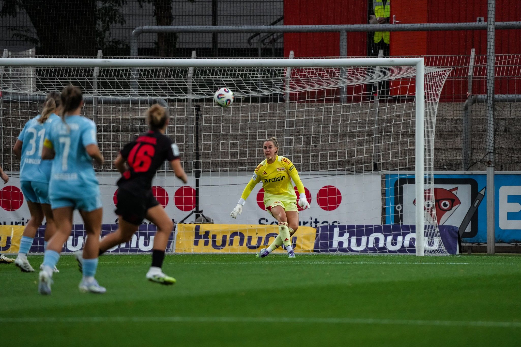 But Union wouldn’t heed their warning and a minute later Bayer threatened again, this time down the inside-left. If her last save had demonstrated the strongest of wrists and the sharpest of reflexes, this time Bösl would spill Vanessa Fudalla’s weaker shot from range, somehow turning away from the ball and letting it slip though her grasp. Bösl has Bundesliga experience. She admonished herself under her breath on the way up