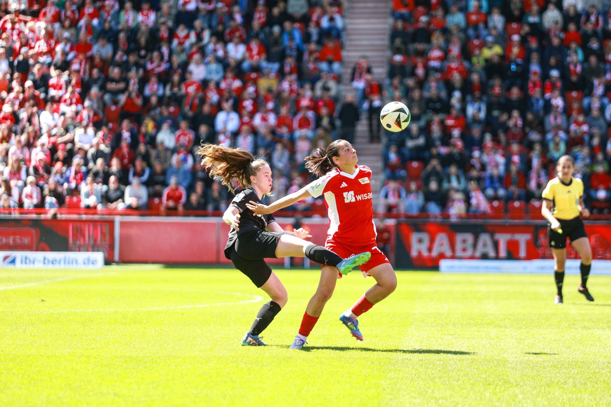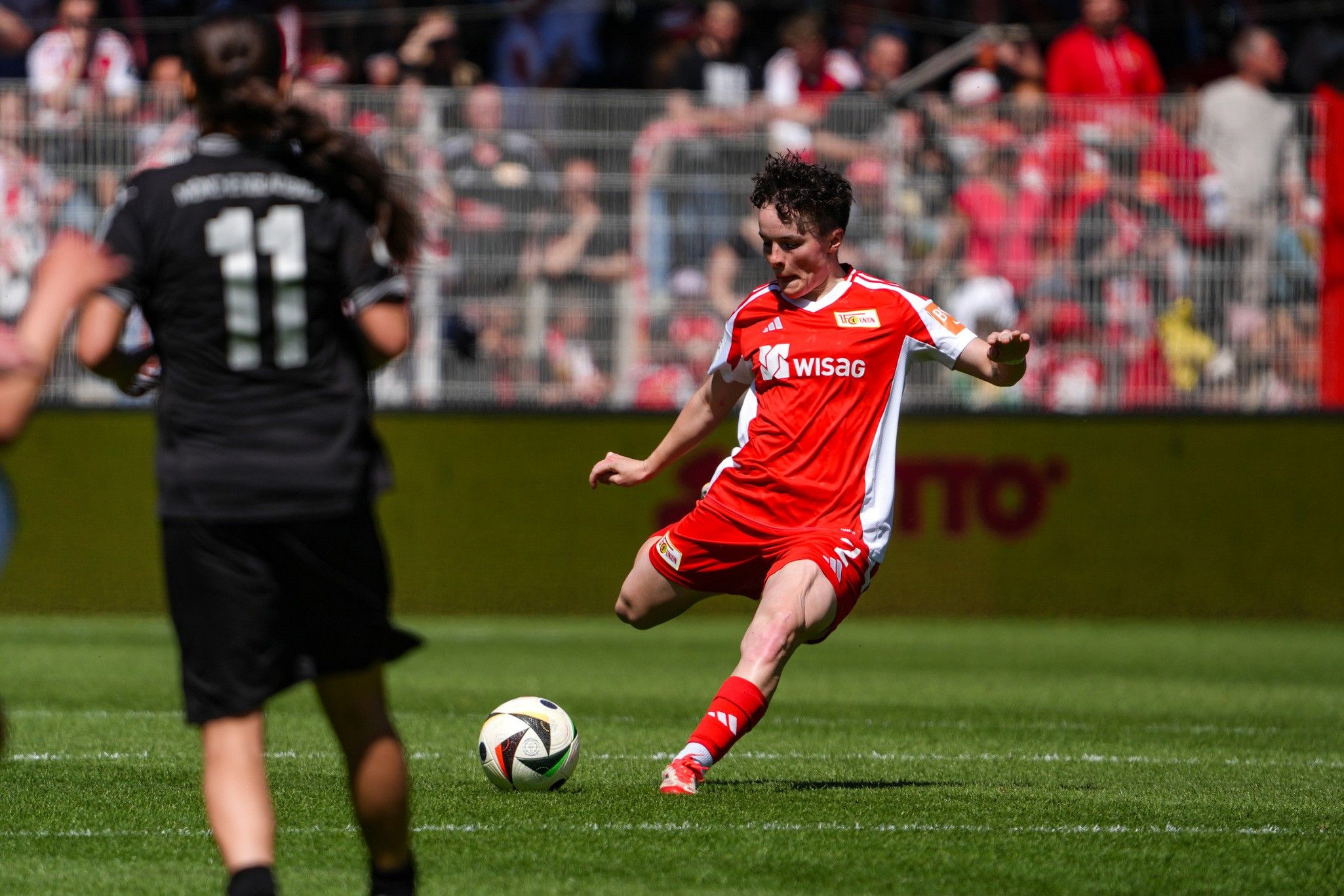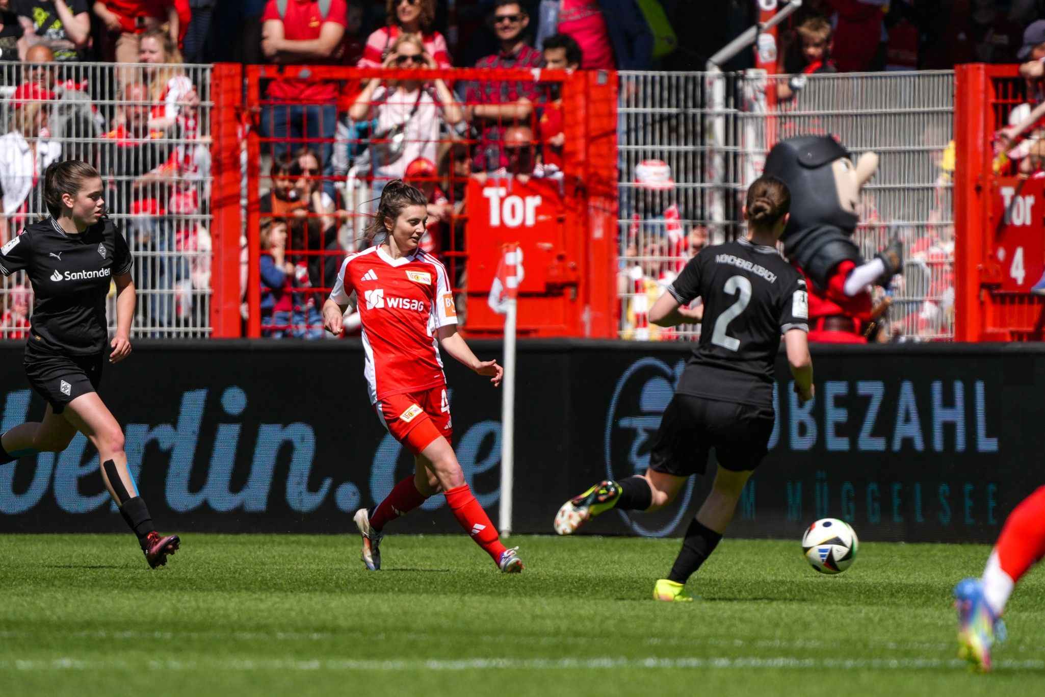 Union, with the wind of the Alte Försterei’s roars at their backs, were unstoppable. Imke Kessels tried to catch hold of Reissner’s shirt as she beat her again, leaving her for dust, this time choosing to set up Pia Metzker, who shot across goal, but just wide.
