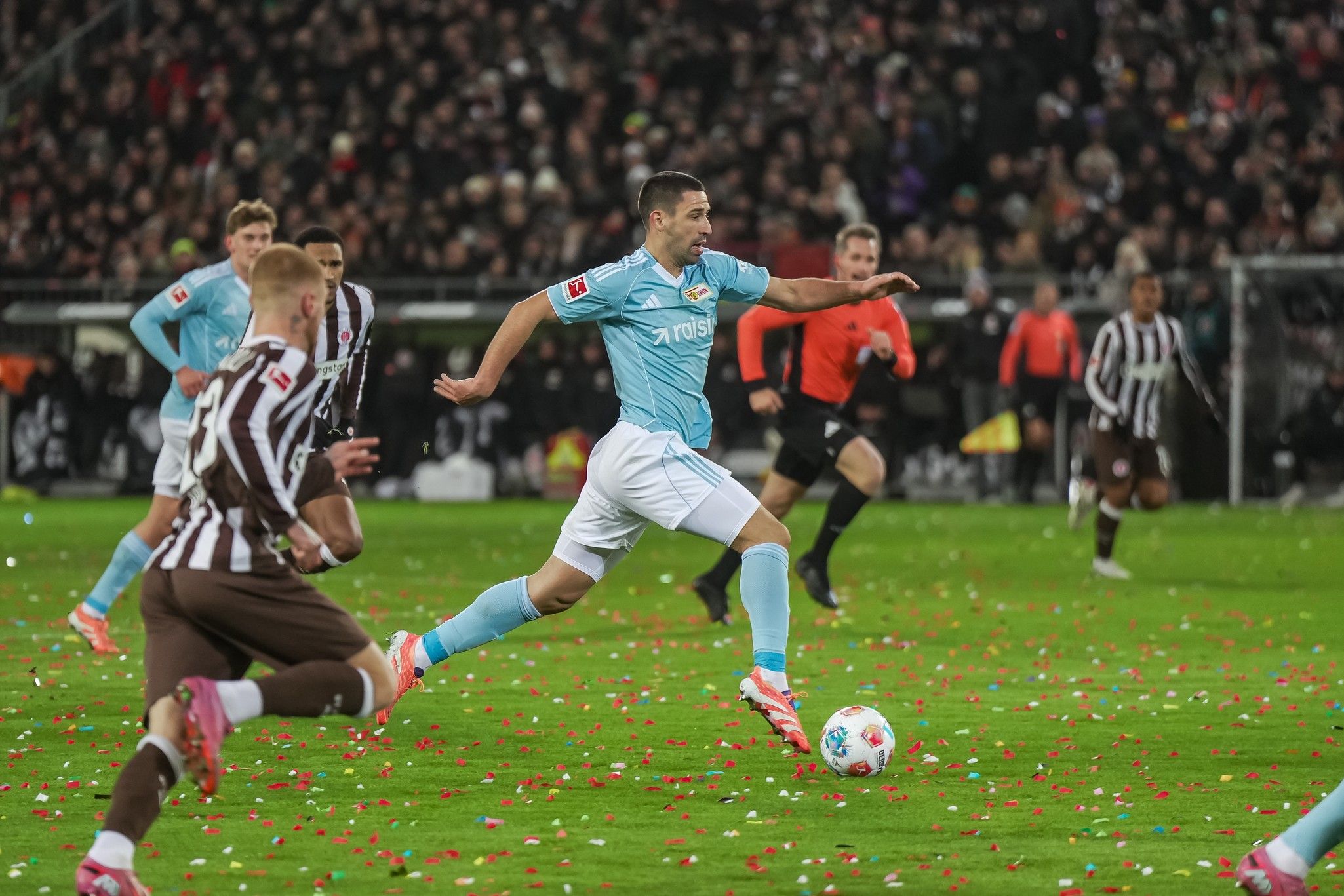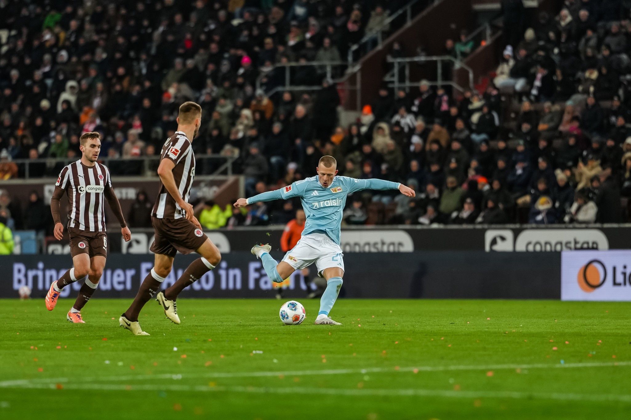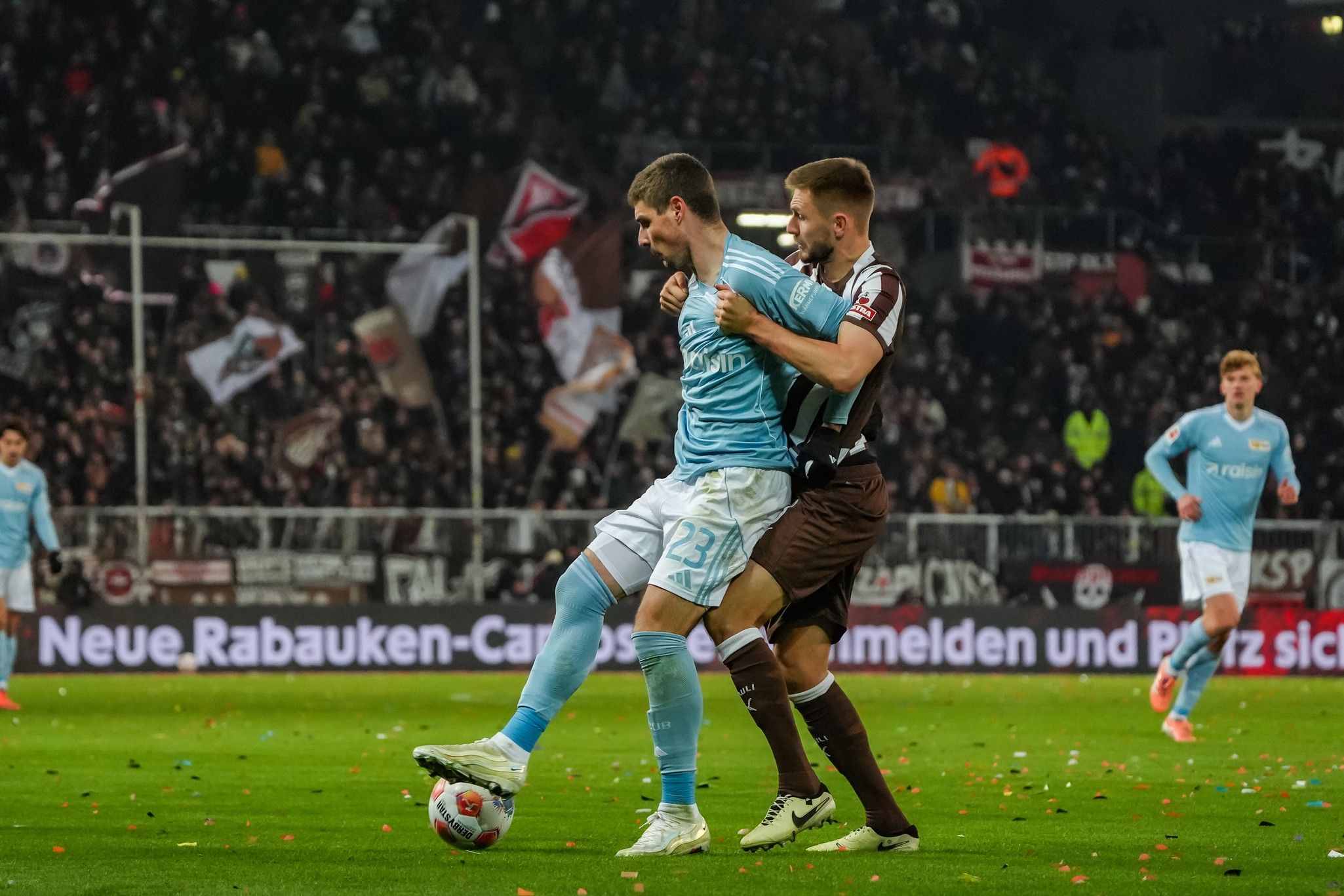 Pauli won two corners in arow, the first as Hauke Wahl tried to beat Leite down the left, the second straight after when Querfeld headed the set-piece away. But though they strived to carve out a credible opening, everything the hosts did was just as easily repelled by the indomitable Union back-line, with Ansah joining in the dog-work at the back alongside Rothe on the left, and Leite winning header after header in the box.
