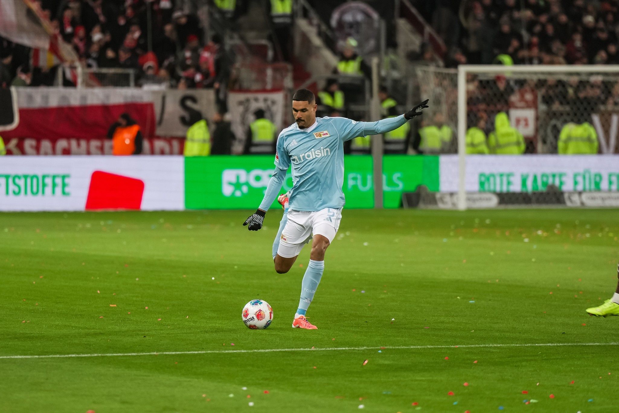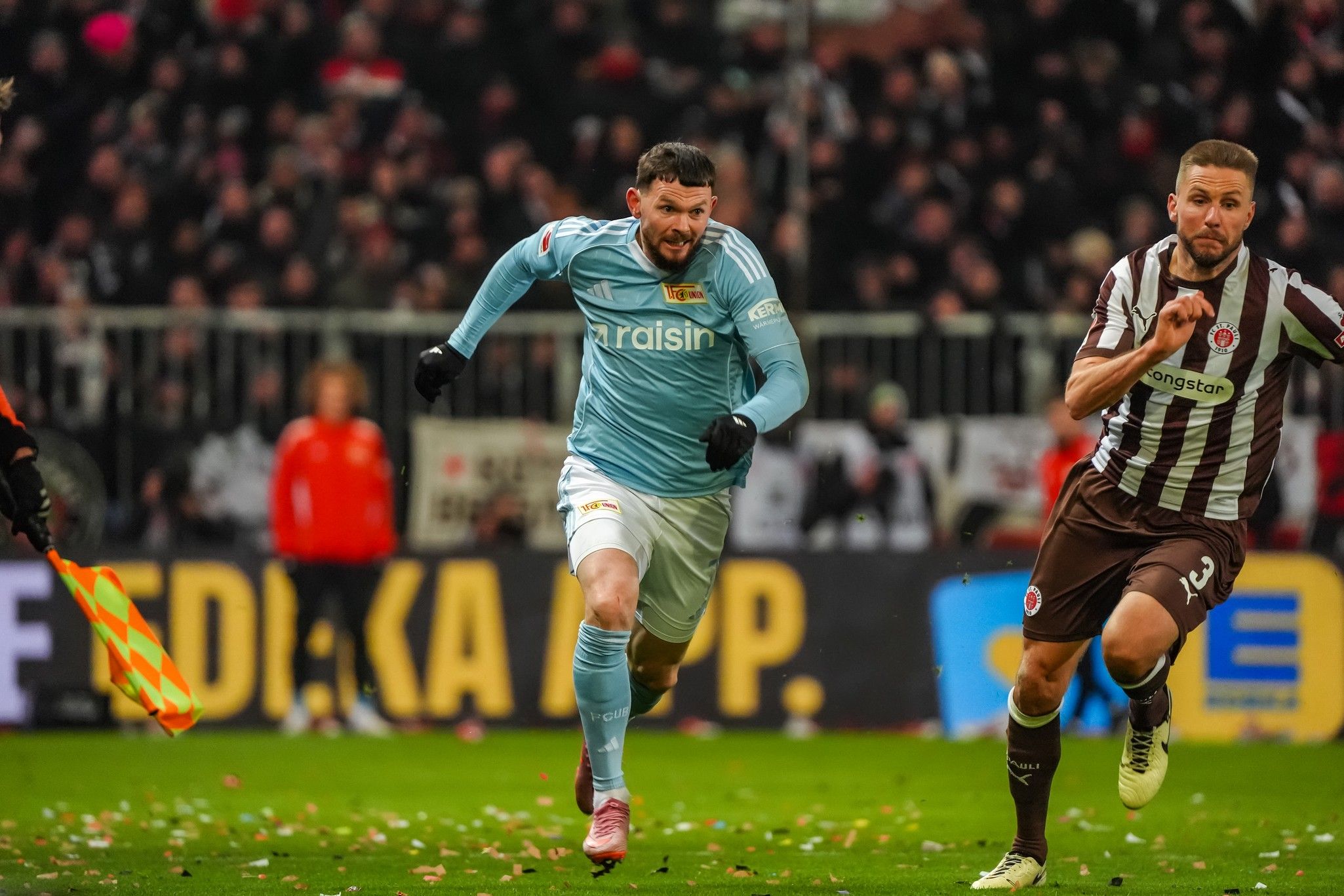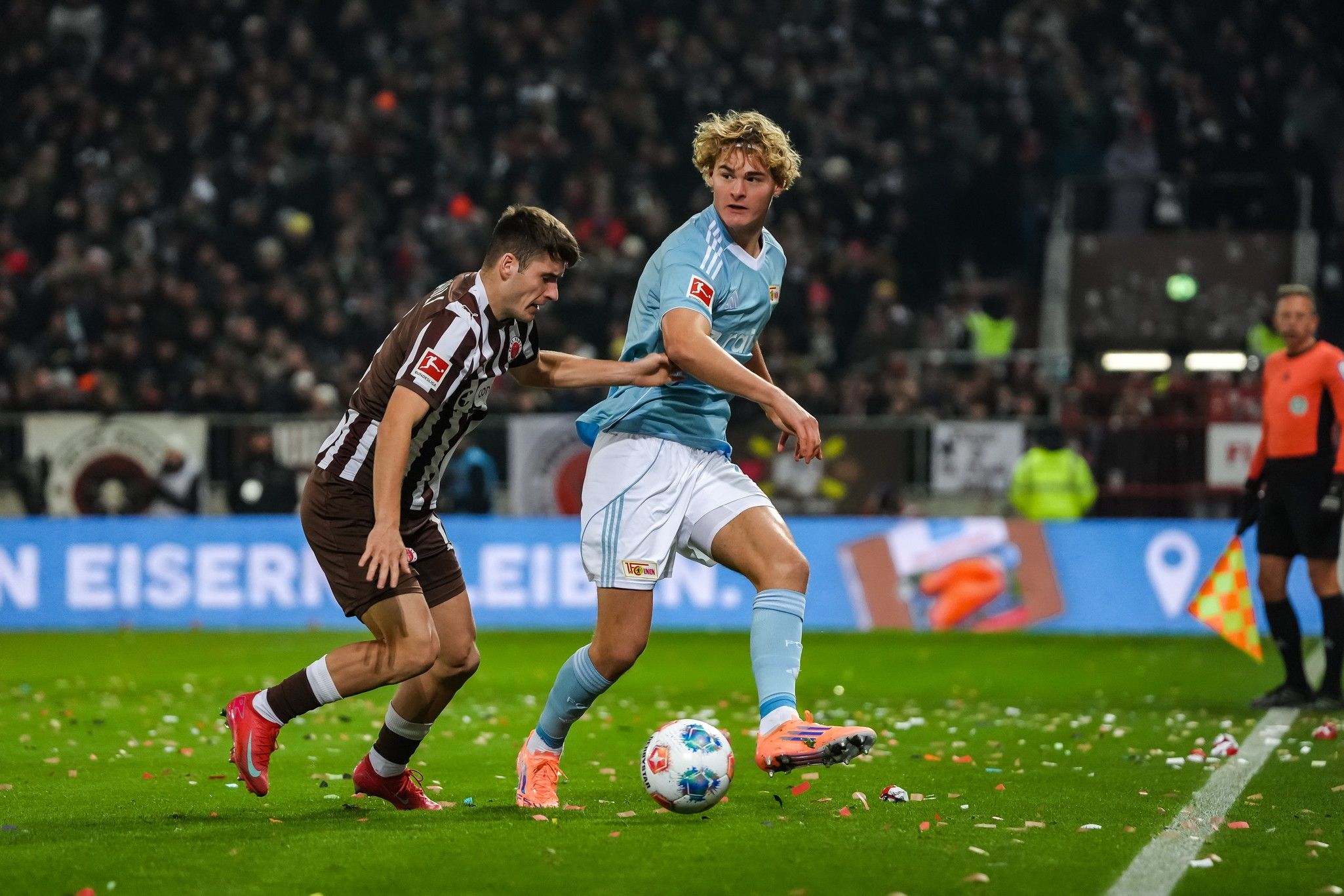 Pauli won two corners in arow, the first as Hauke Wahl tried to beat Leite down the left, the second straight after when Querfeld headed the set-piece away. But though they strived to carve out a credible opening, everything the hosts did was just as easily repelled by the indomitable Union back-line, with Ansah joining in the dog-work at the back alongside Rothe on the left, and Leite winning header after header in the box.