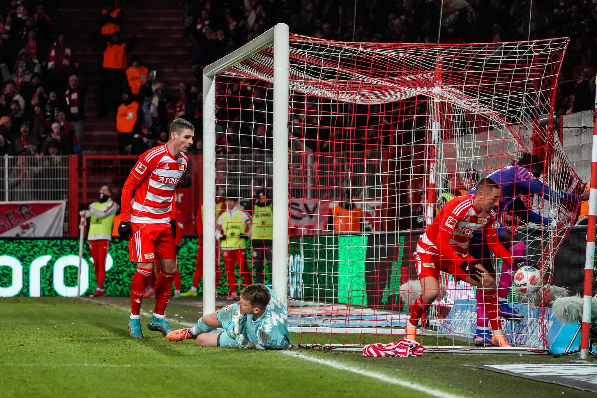 Janik Haberer made a fine, thundering stop on that other former Unioner, Benedict Hollerbach, soon afterwards, launching into his tackle through the mire on Union’s left. It was a day of many returns, of course, and Hollerbach would put his own effort too close to his old teammate, Rönnow, on quarter of an hour, looking to shoot across him when suddenly a gap opened up. He was then there when Diogo Leite got booked four minutes later, dramatically falling under the Portuguese’s challenge while out right this time.